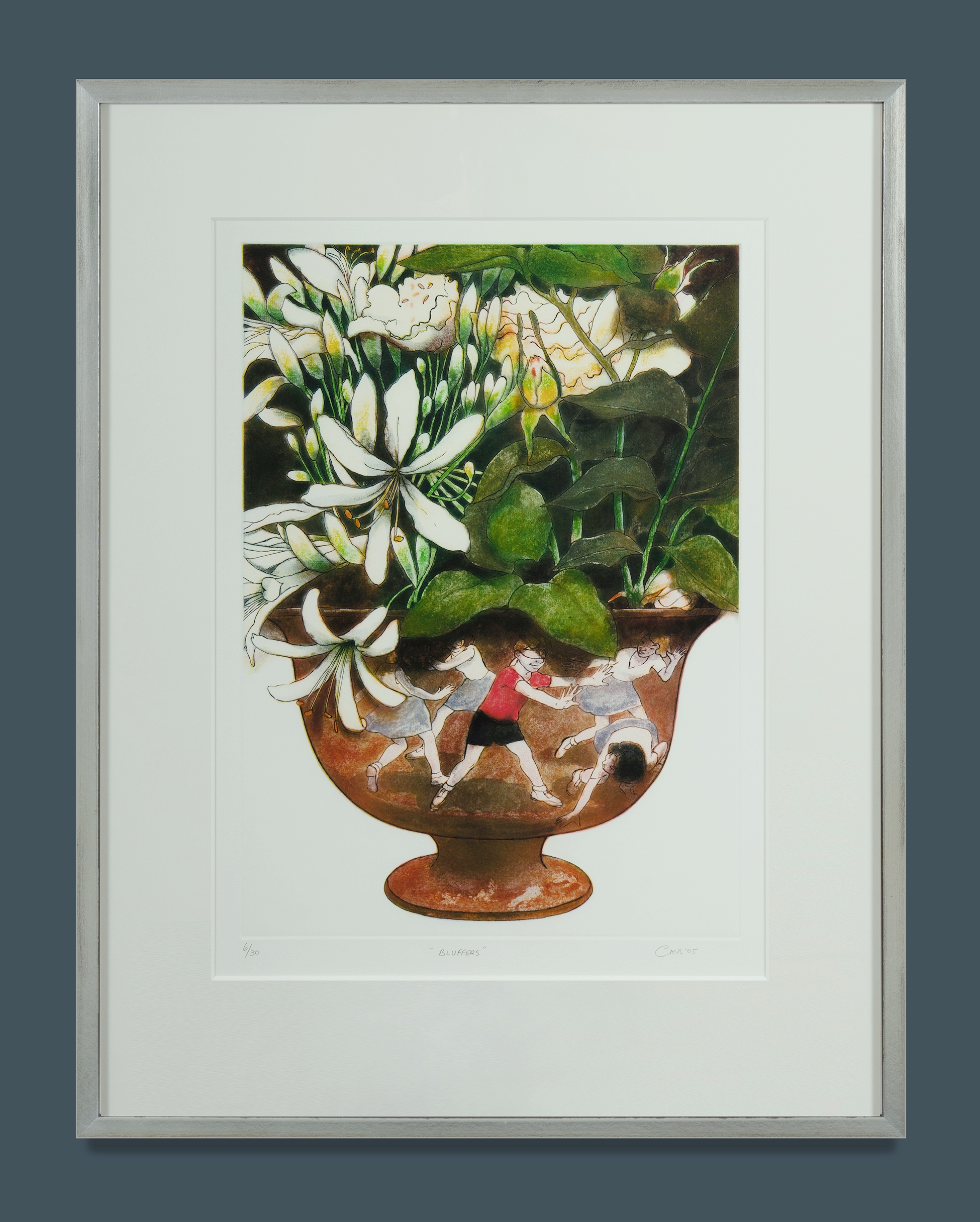 CRESS, Fred (1938-2009) 'Bluffers,' 2005. From the Children's Games Series. Published by Berkeley Editions, Sydney. Printed by Dianne Lewis, Lewis Editions. Collections: National Gallery of Australia, Canberra, accession number 2006.875 (impression 8/30). Multi-plate Coloured Etching 6/30 55x40cm (plate) 79x60cm (sheet) Estimate $200-350