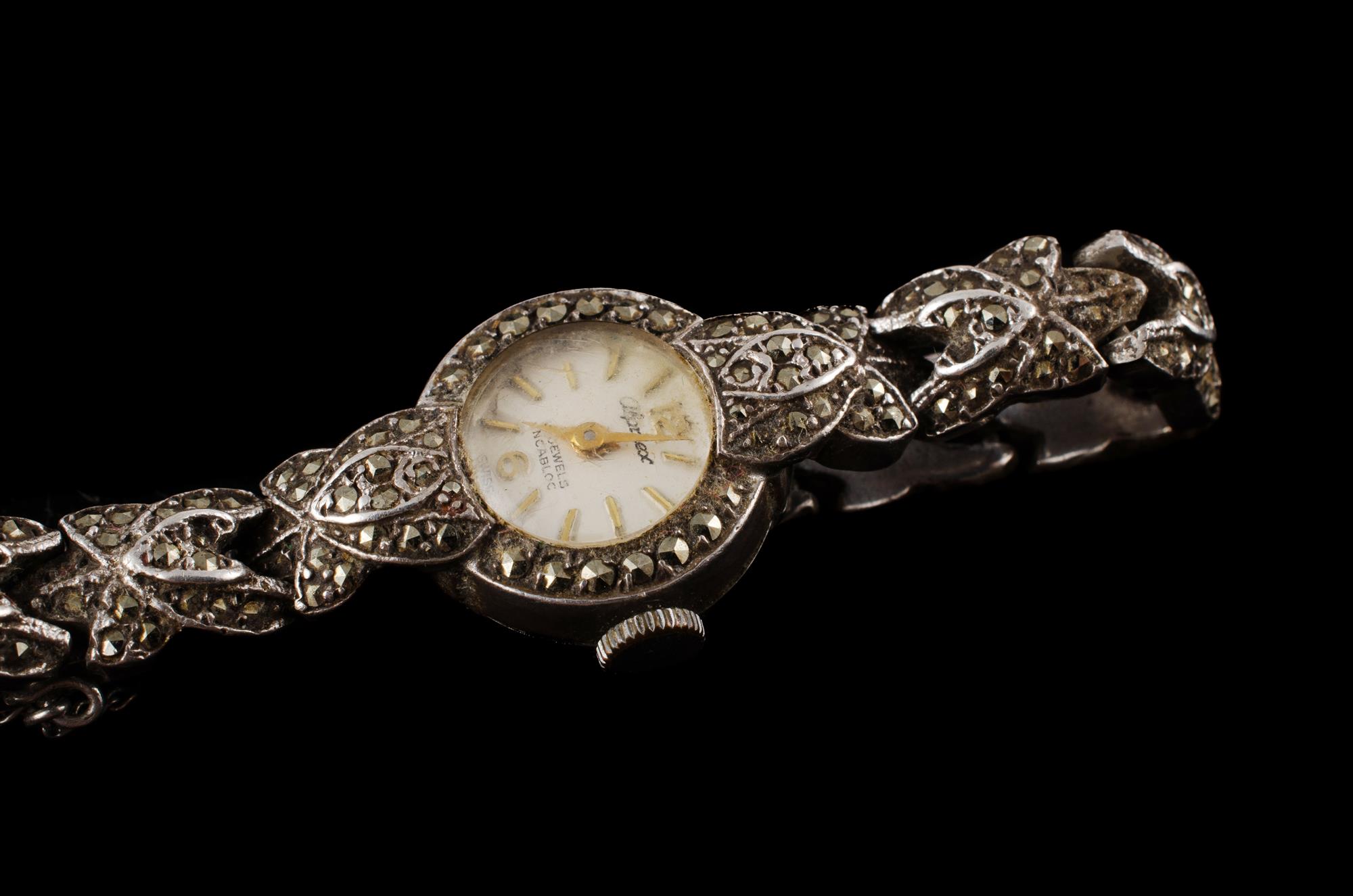 Two Silver & Marcasite Watches Wristwatch 17 jewel 'Alpinex' (one stone missing); & brooch watch 17 jewel 'Zetus' Provenance: Deceased Estate, Sydney.Estimate $40-70