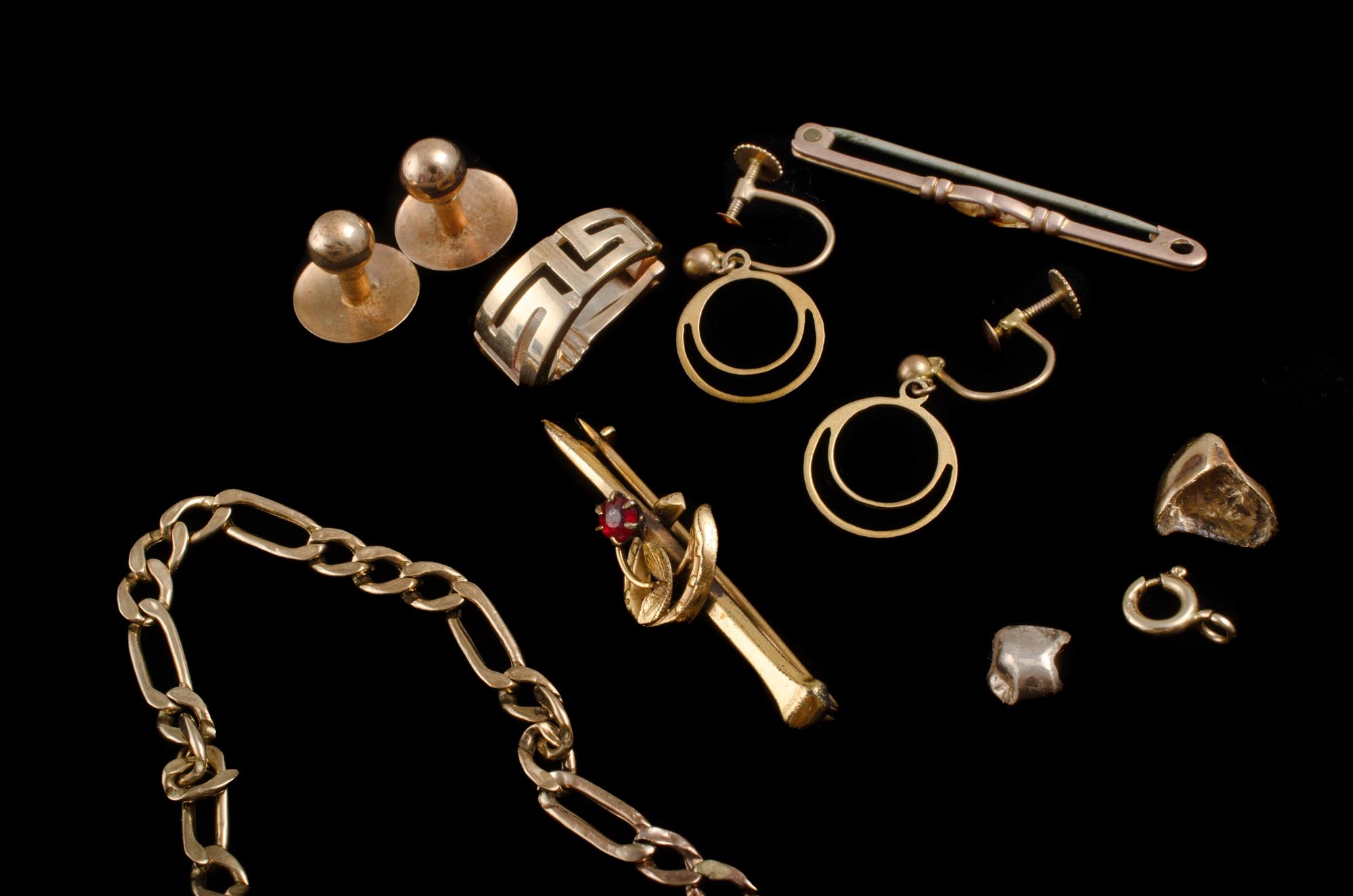 Various 9ct, 14ct & 18ct items 2 9ct brooches, 2 9ct pink gold screw on earrings & AF bracelet, 18ct bolt ring & 2 gold teeth (test 18 plus) & 1 (only) 14ct earring 9ct (83g) 18ct (3.37g) 14ct (3.2g) Total weight 15.37g Provenance: Deceased Estate, Sydney.Estimate $325-600