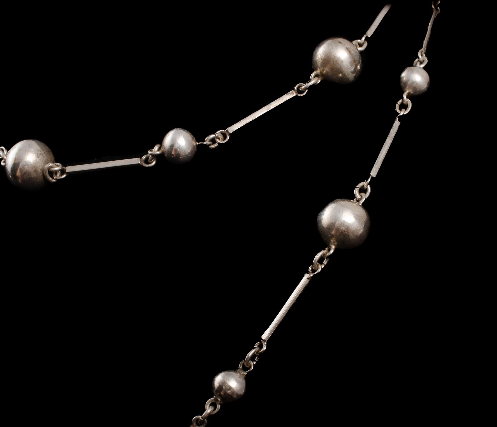 800 Silver Ball & Bar Necklace Approx. 90cm long, plus drop Total weight approx. 34.59g Provenance: Deceased Estate, Sydney.Estimate $50-80