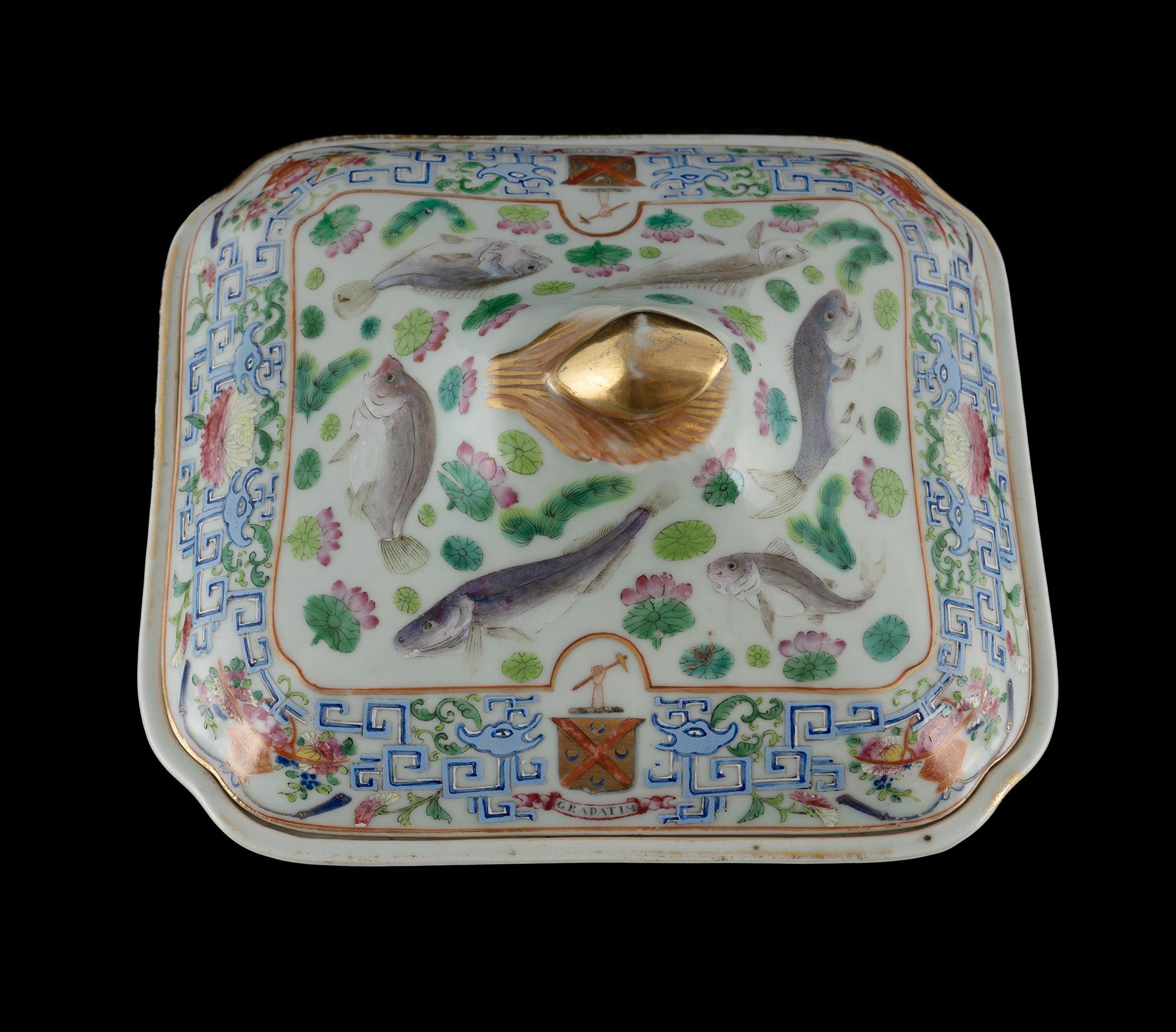 Chinese Export Famille Rose Armorial Serving Dish Early 19th century bearing the coat of arms of Deakin above the ribboned motto 'Gradatim.' Interior profusely decorated. H14cm L24cm D22cmEstimate $600-800