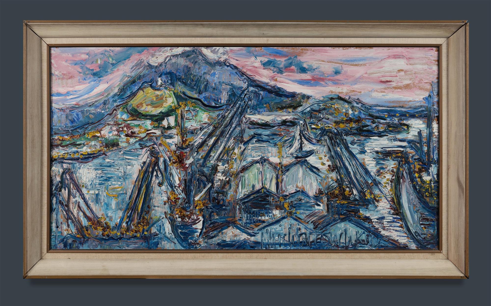 MICHOUTOUCHKINE, Nicolai (Russia/Vanuatu 1929-2010) 'Waterfront Sunset' Oil on Panel 55x105cm PROVENANCE: Deceased Estate, Sydney.Estimate $300-600