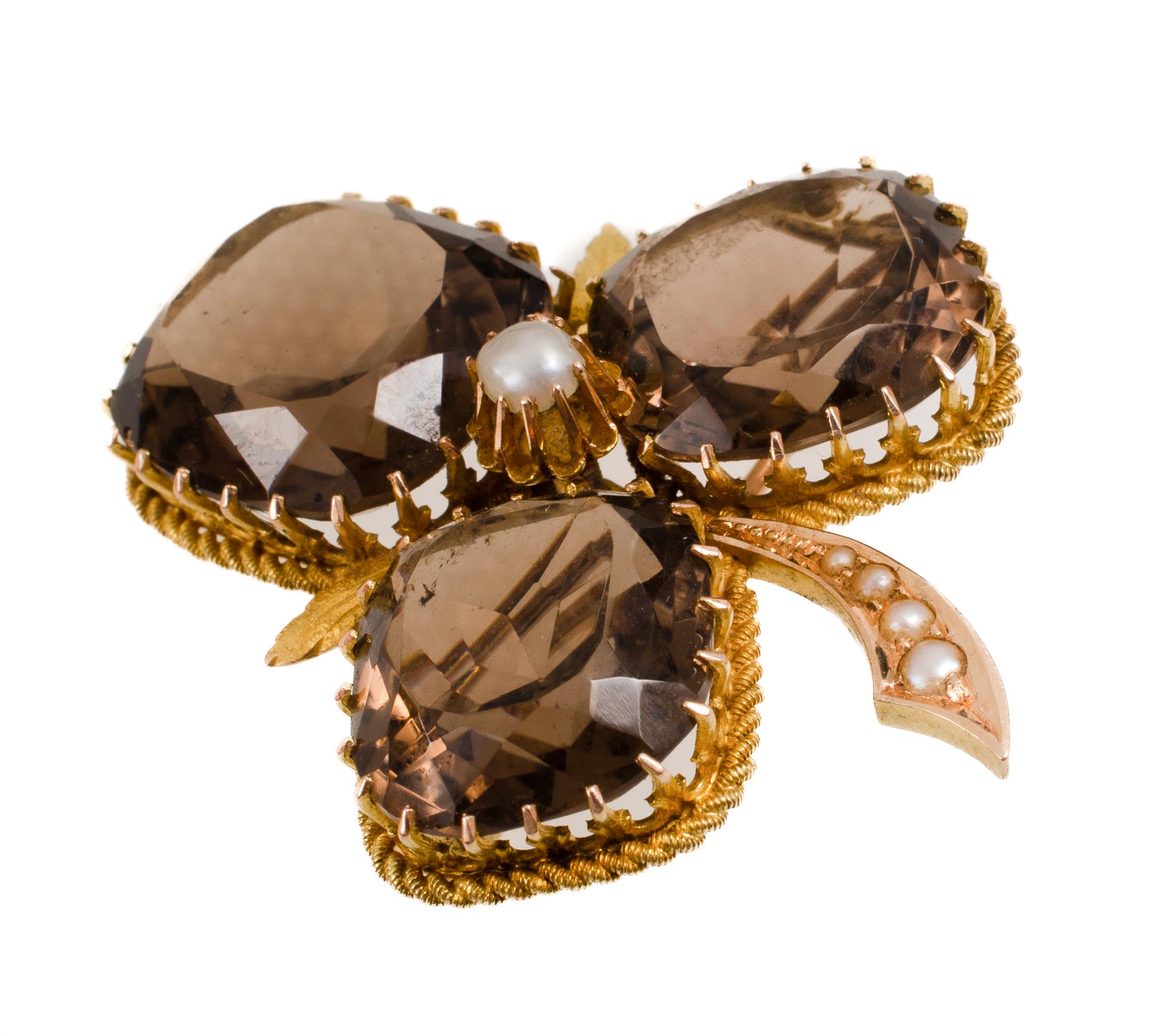 14ct Yellow Gold, Smoky Quartz & Pearl 3 Leaf Clover Brooch 3 leaf clover set with 3 large cushion cut smoky quartz & with 1/2 pearls to centre & stem. Smoky quartz weight around 35.3ct Total weight approx. 13.53gEstimate $450-800