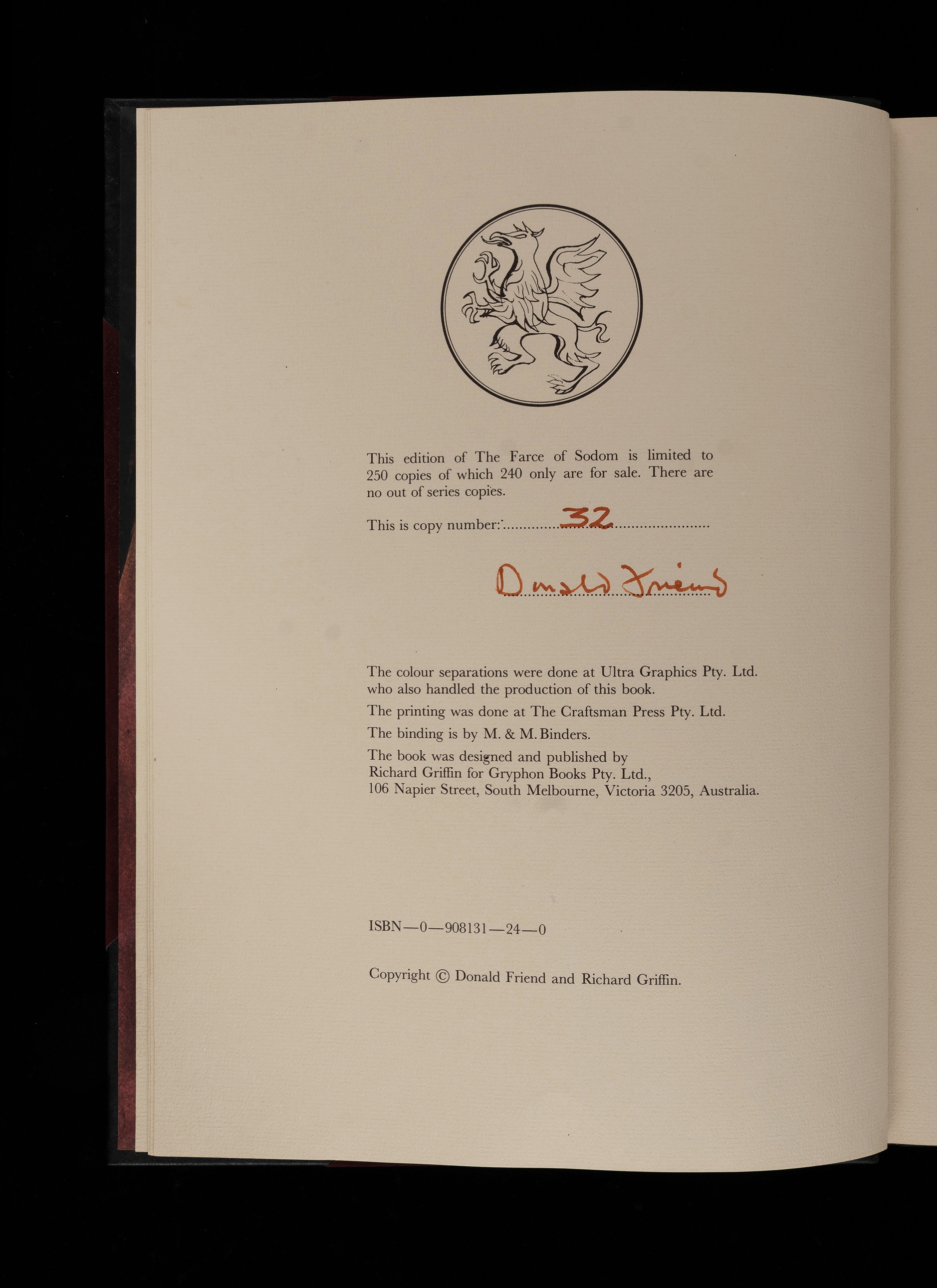 BOOK, 'The Farce of Sodom,' by Donald Friend. Gryphon Books, Melbourne, 1980. With tipped-in plates, limited edition 32/25. Signed by the author. With slip case.Estimate $200-300