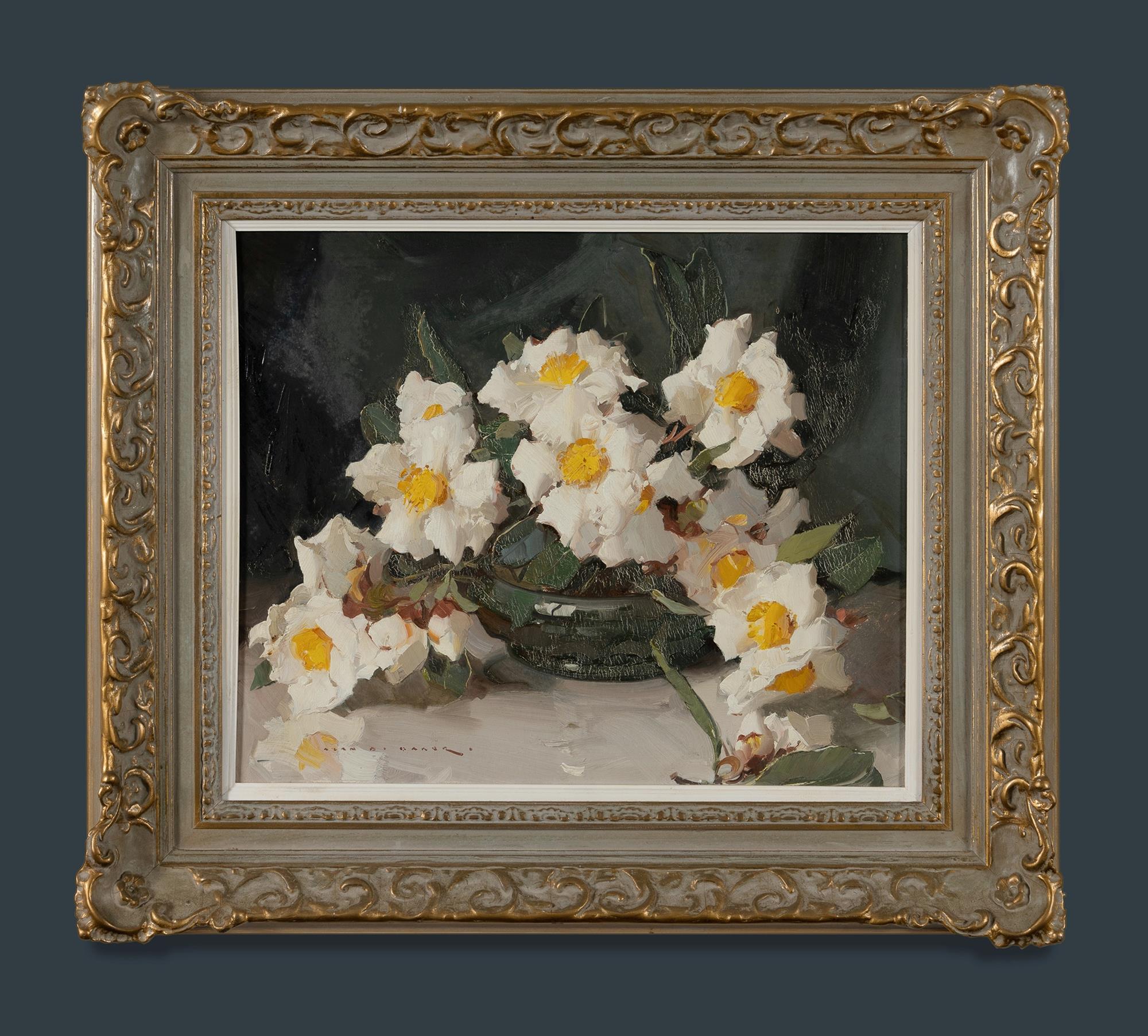 BAKER, Alan Douglas (1914-1987) White Peonies in Green Bowl Oil on Board 35.5x43cmEstimate $500-800