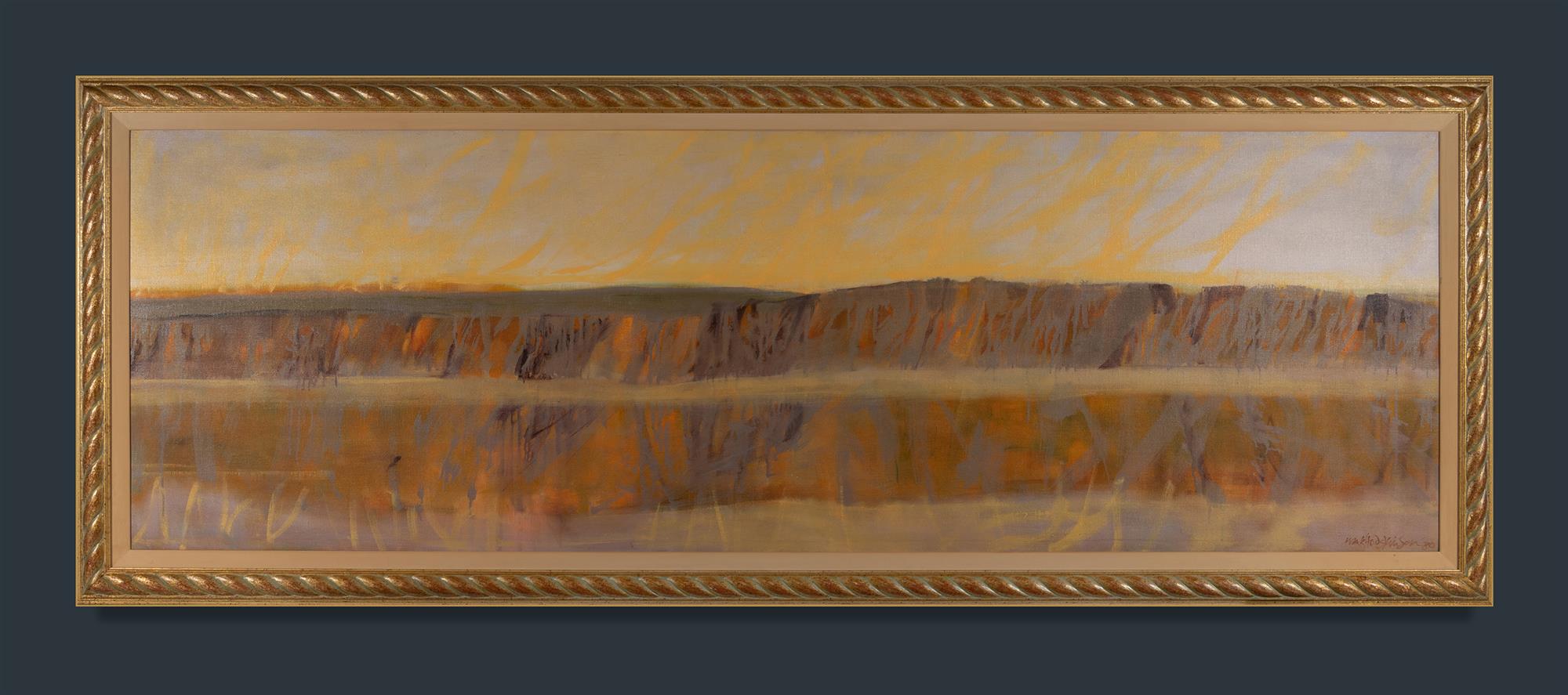 HODGKINSON, Frank George (1919-2001) 'Lightning Dreaming' [The Arnhem Land Escarpment], 1980. Oil on Canvas 84x260cmEstimate $1,000-3,000