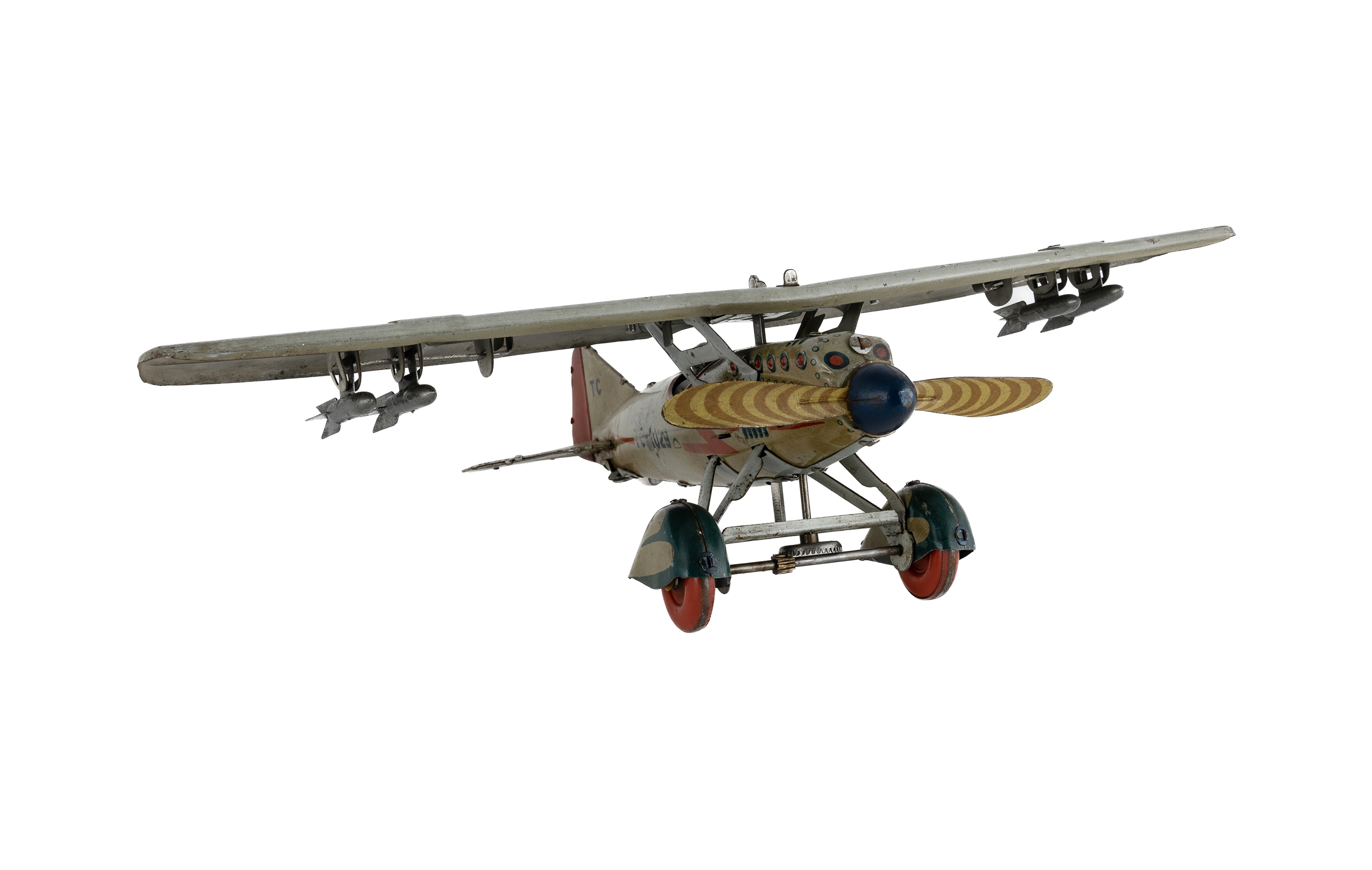 Tippco Lithographed Tinplate Aeroplane. Monoplane clockwork bomber with bomb dropping mechanism, c.1935. Some paint darkening to fuselage, otherwise good. L26cm (2Piv)Estimate $500-1,000