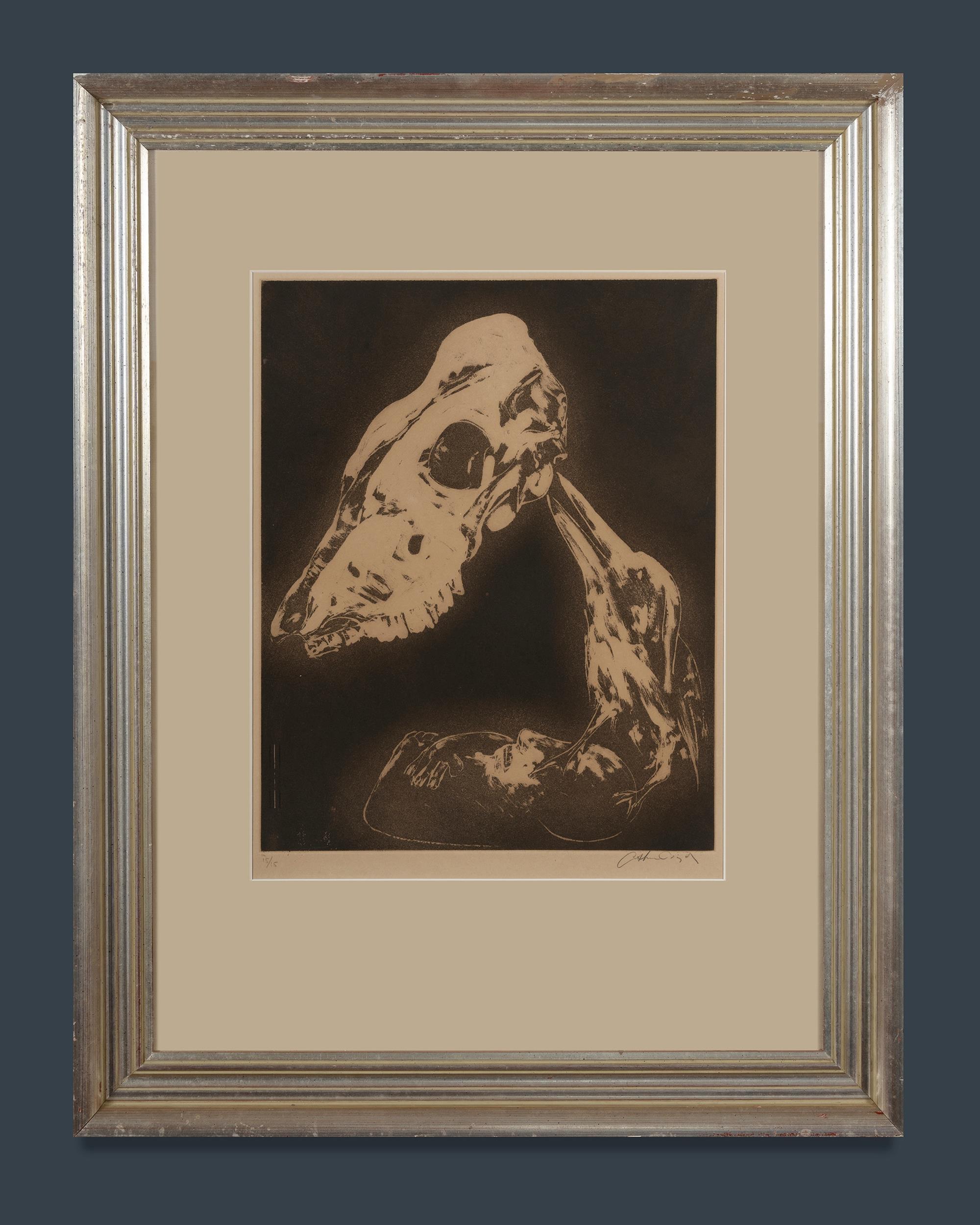 BOYD, Arthur Merric Bloomfield (1920-1999) 'Narcissus, Kookaburra and Skull,' 1978. Printed by Max Miller, East Kangaloon, NSW. Aquatint in Brown Ink 15/15 50.5x40cm (plate)Estimate $400-700
