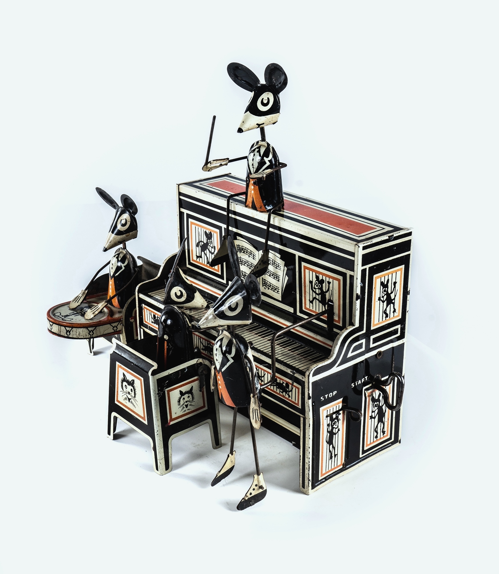 Louis Marx & Co. Lithographed Tinplate Mouse Band. Marx Merrymakers 1920s with animated conductor, pianist, drummer and dancer. Complete, all working. Some scratches but overall good condition. (H25cm) (9E)Estimate $600-1,000