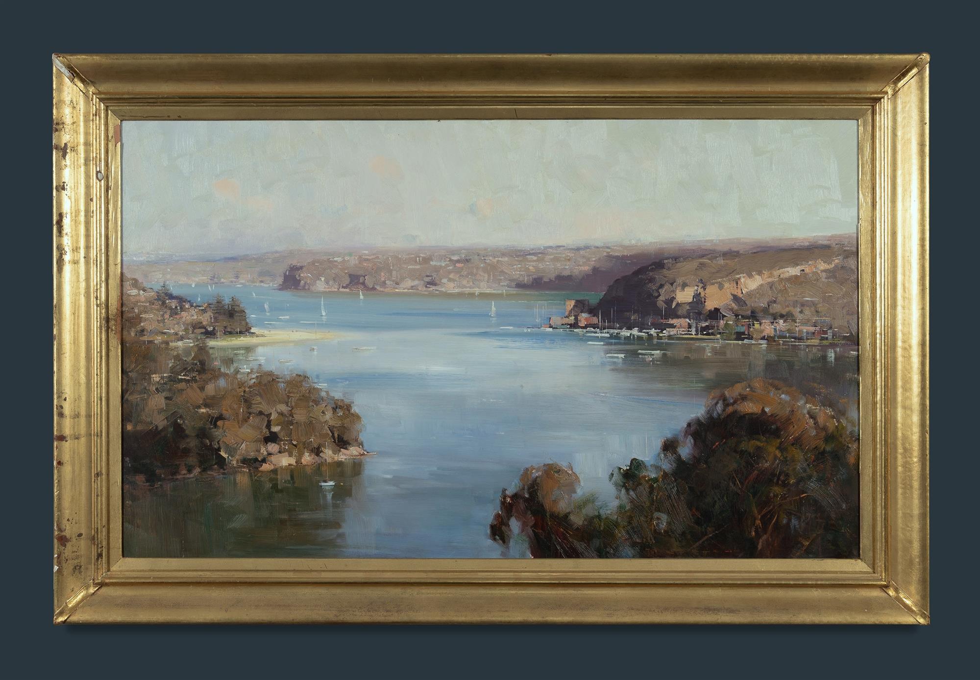 KNIGHT, Ken (b.1956) 'Afternoon Reflections [Middle Harbour, Sydney]' Titled verso, with additional signature. Oil on Board 58.5x98.5cmEstimate $3,500-5,500