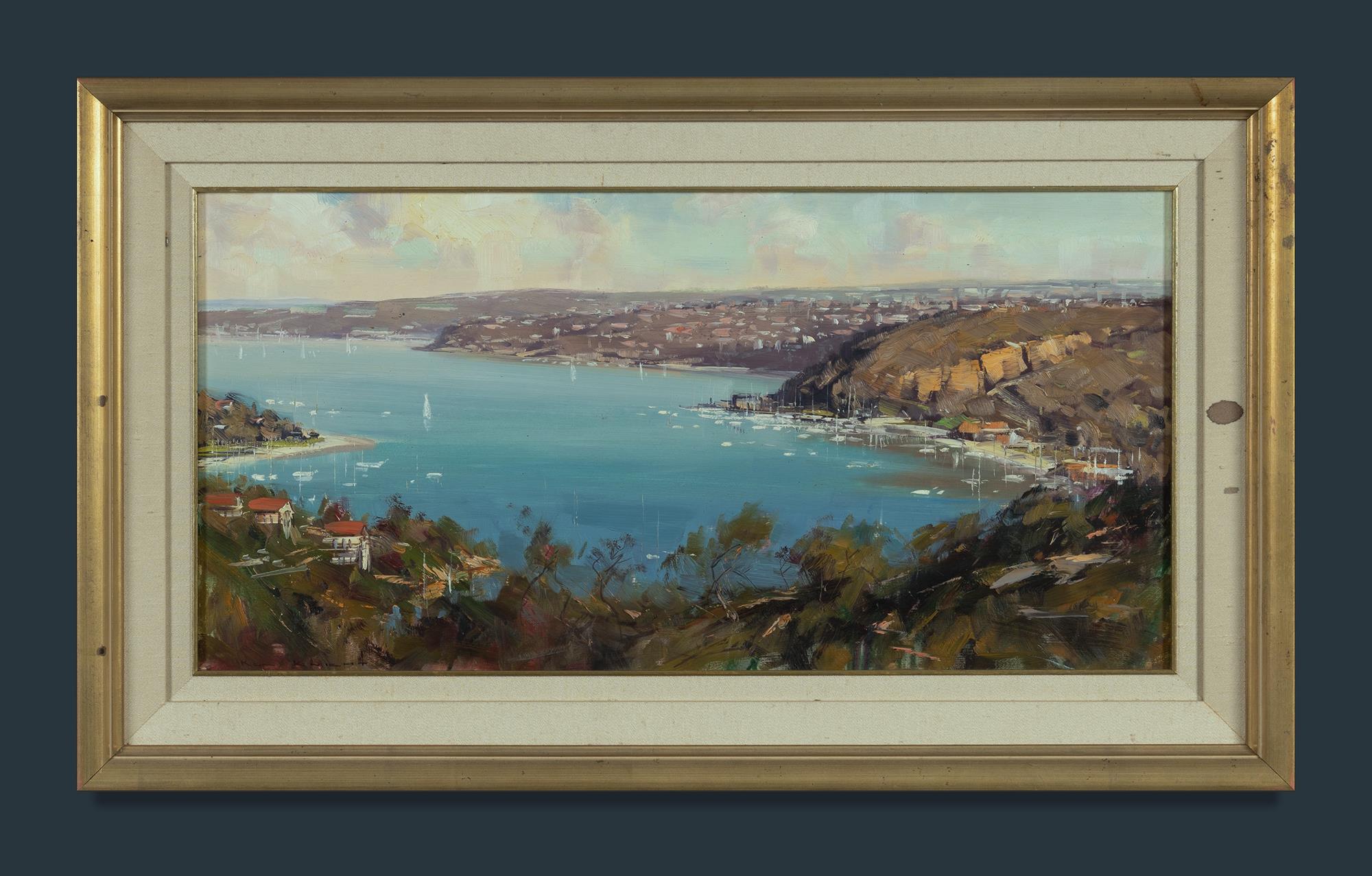 KNIGHT, Ken (b.1956) 'Afternoon Light - Middle Harbour,' 1987. Titled verso, with additional signature & date. Oil on Board 29.5x60cmEstimate $800-1,500