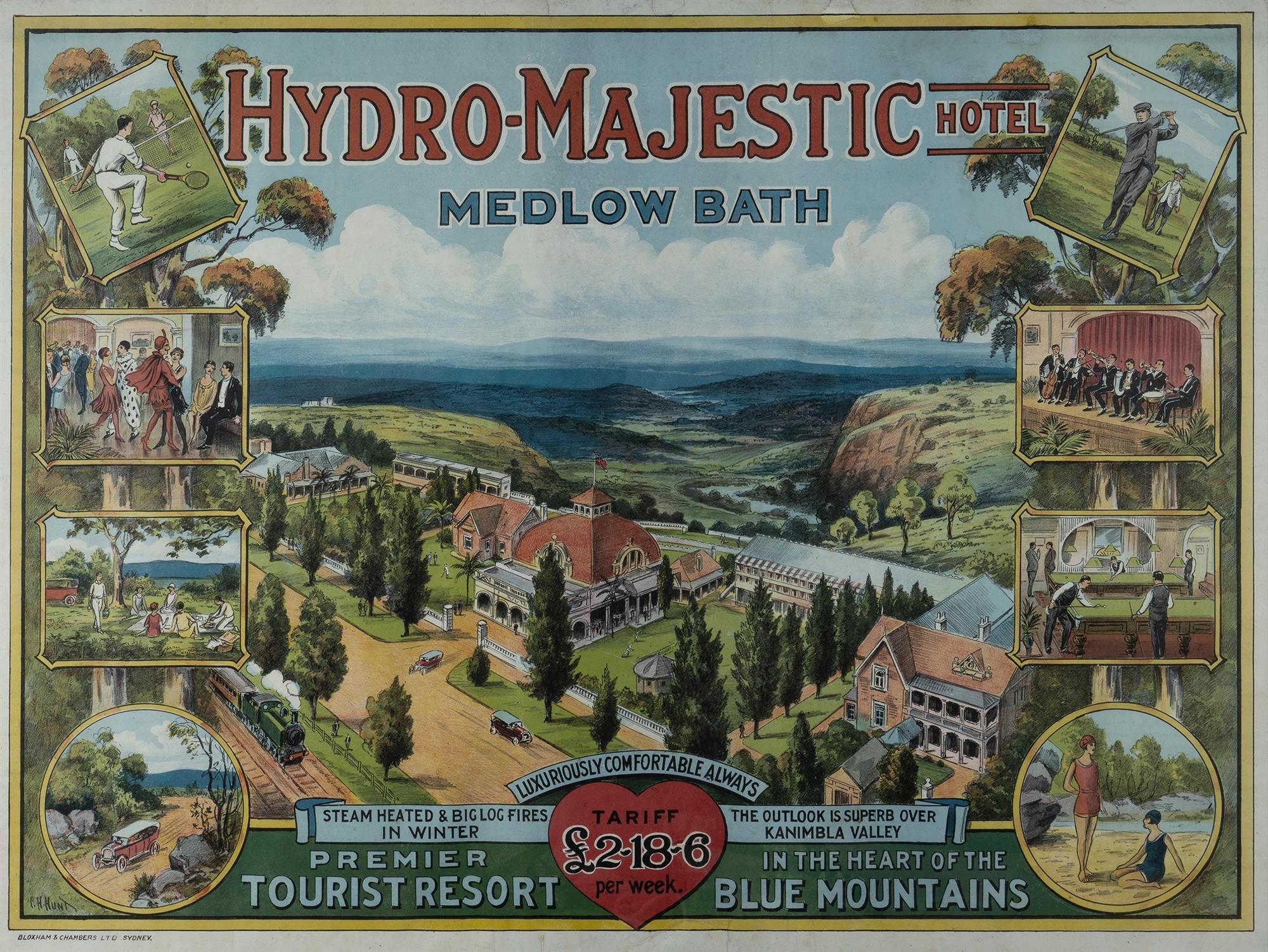 HUNT, Charles Henry (1857-1938) 'Hydro-Majestic Hotel, Medlow Bath,' c.1920s. Original vintage lithographic poster pub. Bloxham & Chambers Ltd, Sydney. Lithograph 75x99.5cm (sight) (lobby)Estimate $1,000-2,000