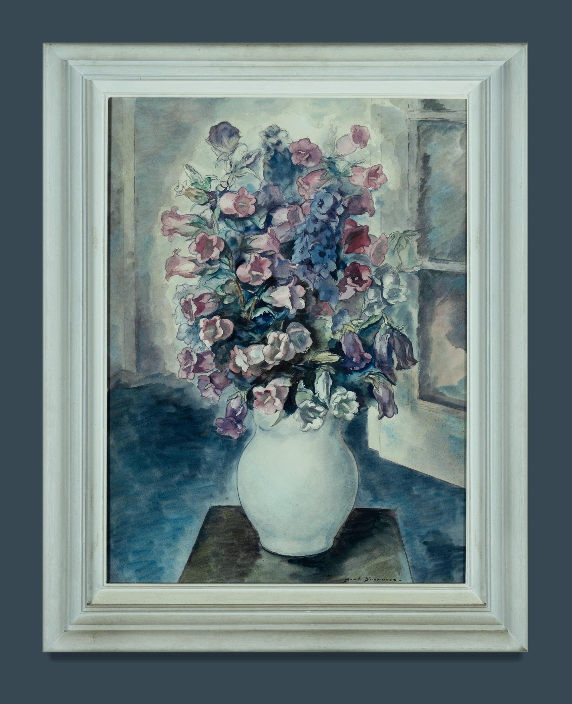SHERWOOD, Maud (New Zealand 1880-1956) Interior Still Life with Canterbury Bells Signed lower right; artist's details also inscribed verso. W/Clr 65x47.5cm (Rm3)Estimate $1,000-2,000