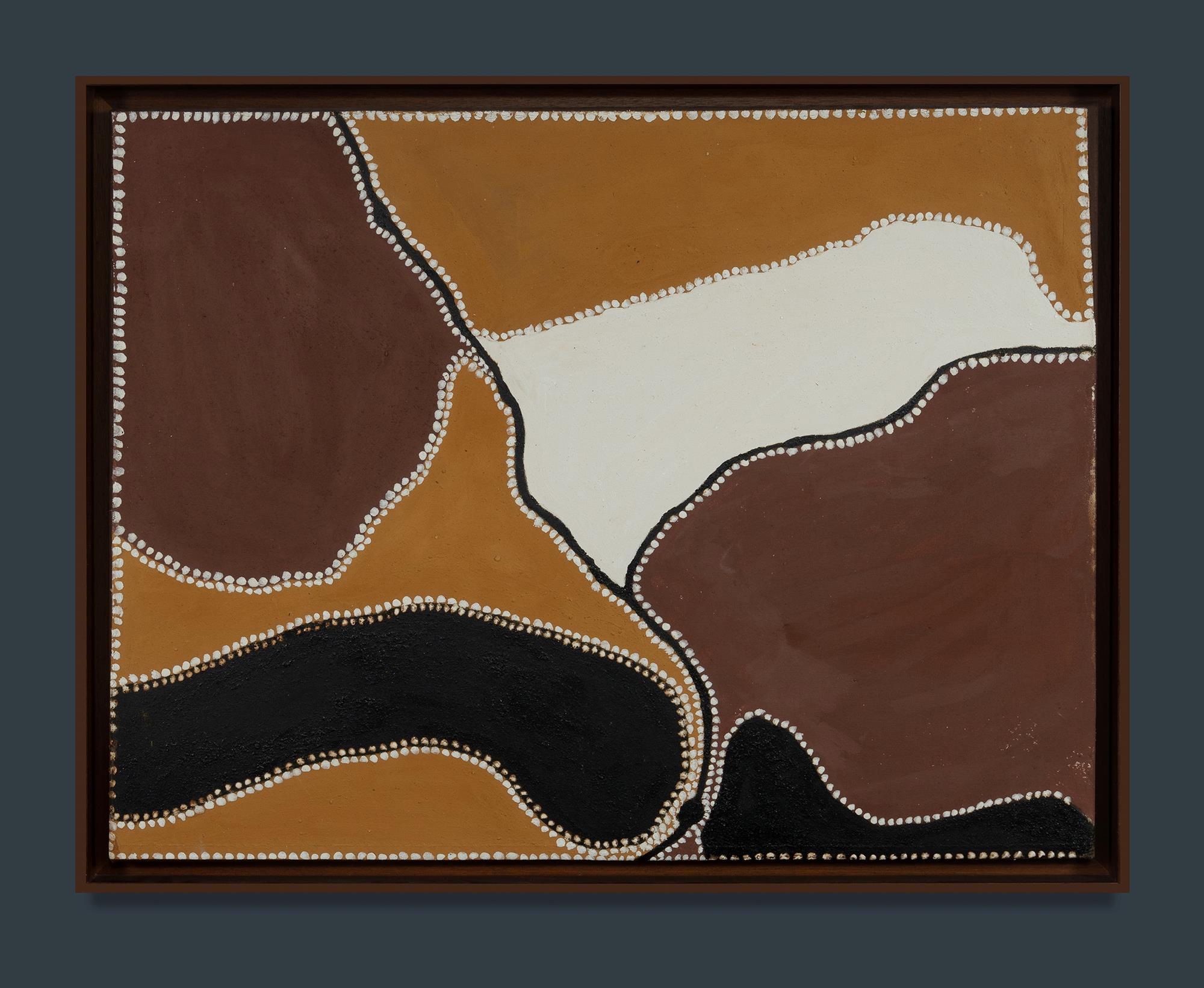 TIMMS, Freddie (Aboriginal c.1916-2000) 'Winnapah Springs,' 1994. Inscribed verso with cat #KA19/12. Natural Pigments & Binder on Linen 63x82.5cm PROVENANCE: Painted at Warmun, Western Australia, commissioned by Kimberley Art, Melbourne (cat #KA19/12); private collection, Melbourne; Shapiro auctions, Sydney, 8 May 2002 (lot 227); CBUS Collection. Estimate $3,000-5,000