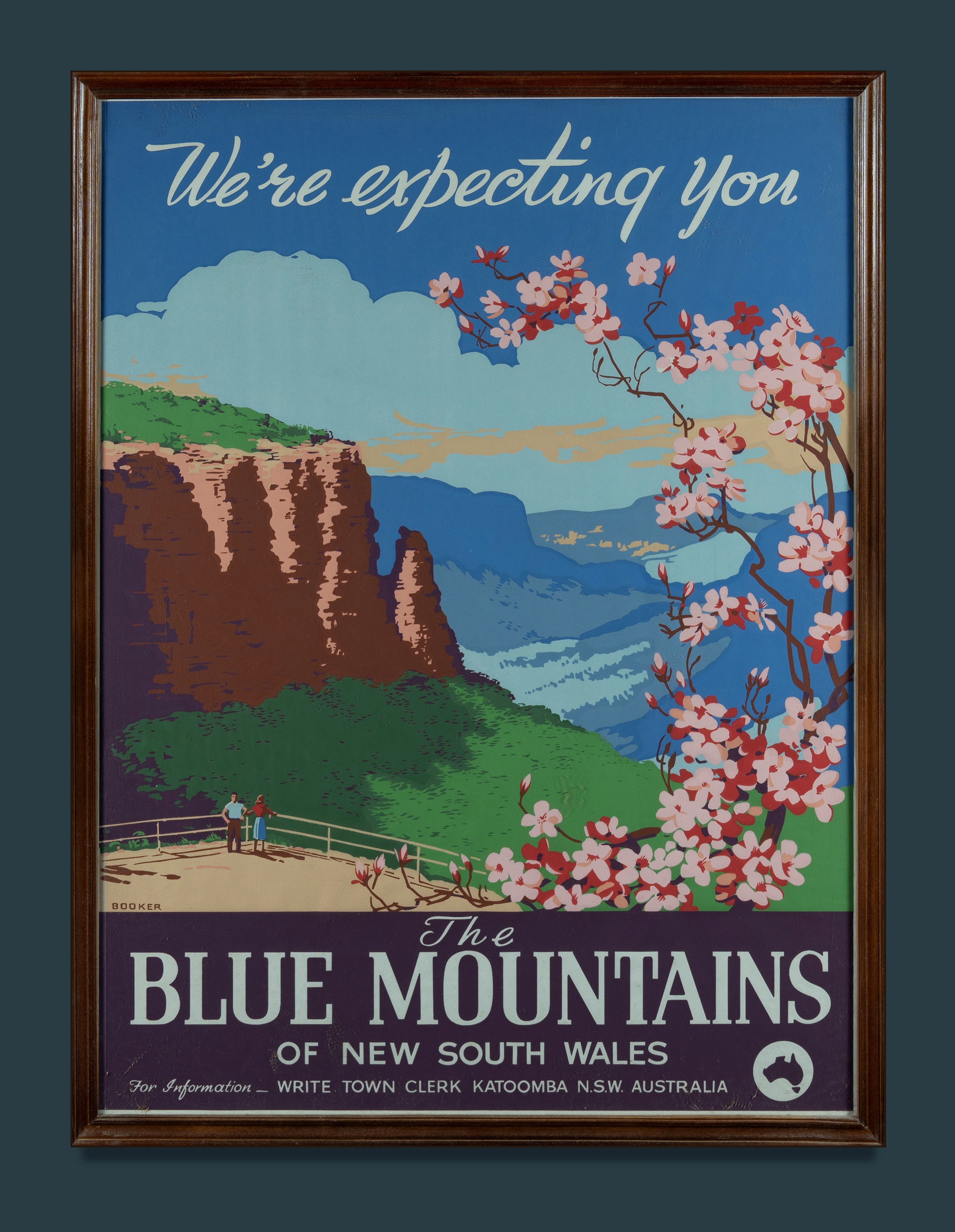 Blue Mountains Travel Poster ‘We're Expecting You' Original c.1950 poster by Joseph BOOKER (1908-1971). Features Megalong Valley view with blossoms in the foreground. Screenprint 100x75cm (Rm4)Estimate $400-800