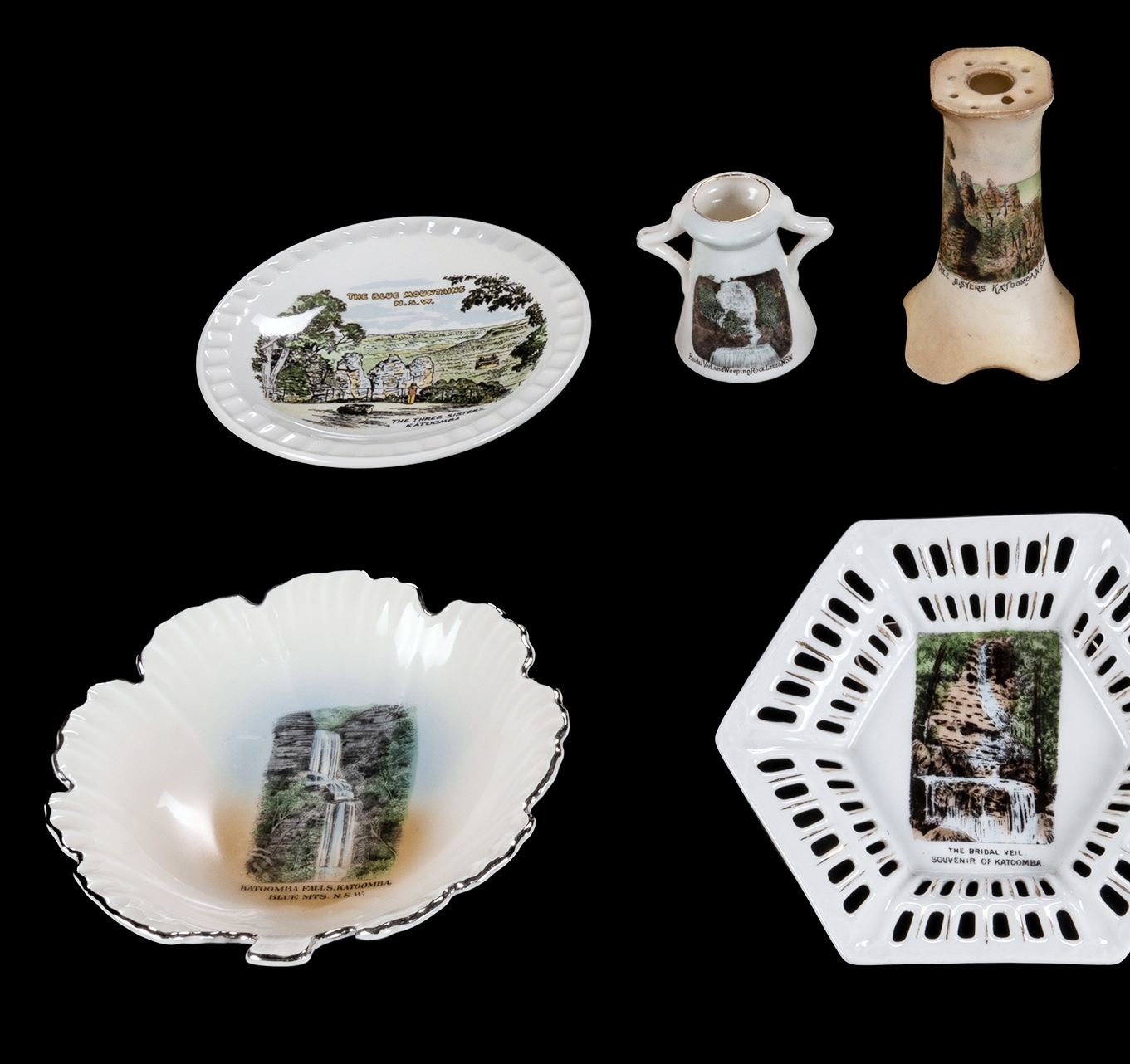 8 Blue Mountains Souvenir Items. Three small vases and five bowls/pin dishes featuring the Three Sisters and Katoomba Falls. Various makers. (Rm4)Estimate $80-150