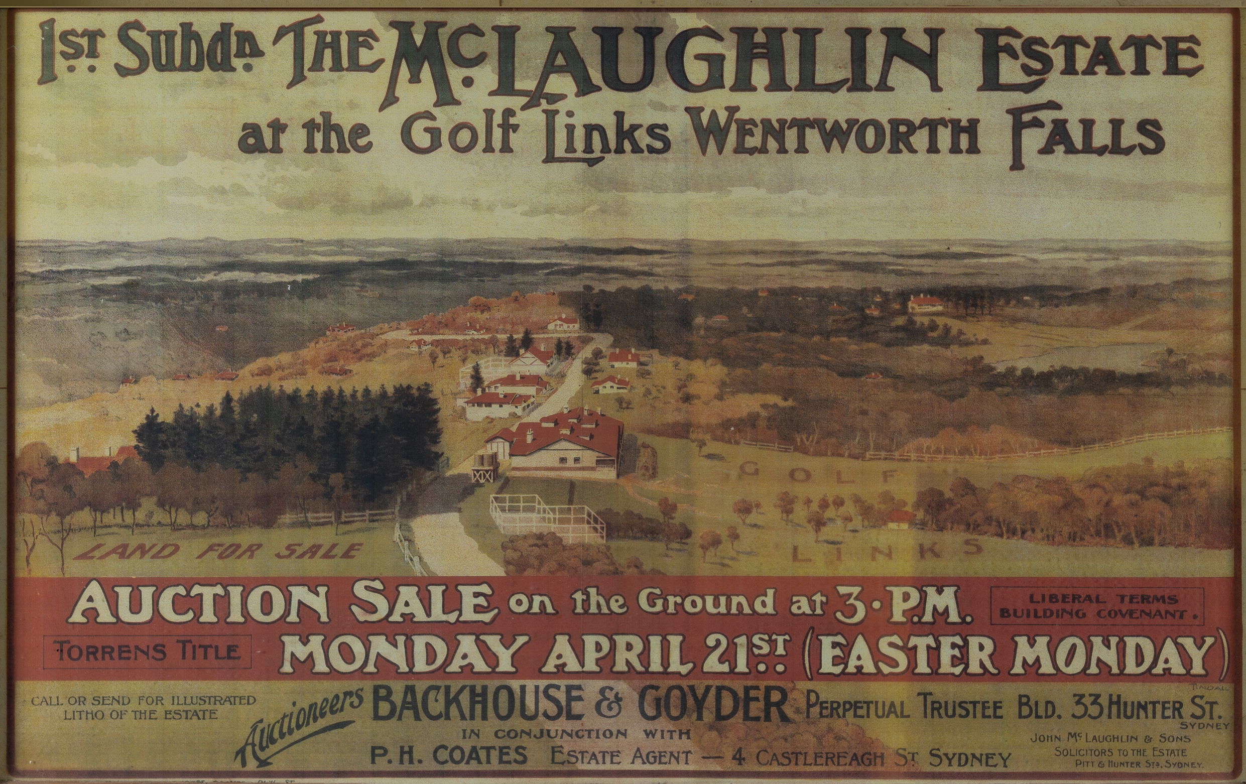 Wentworth Falls McLaughlin Estate Land Sale Poster. Reproduction poster from the original 1924 sale. Depicts Golf Links and plateau view. (36x58cm) (Rm4)Estimate $60-100