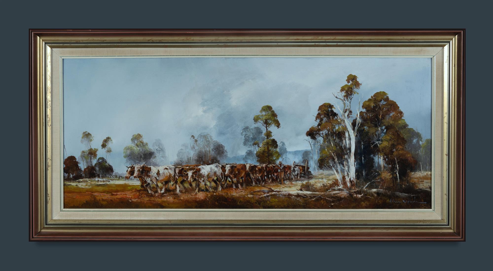 DOYLE, d'Arcy (1932-2001) 'The Bullocky Train' Oil on Board 49.5x121cm PROVENANCE: Burleigh Art Gallery, Burleigh Heads; private collection, NSW (purchased from the above in 1984).Estimate $5,000-8,000