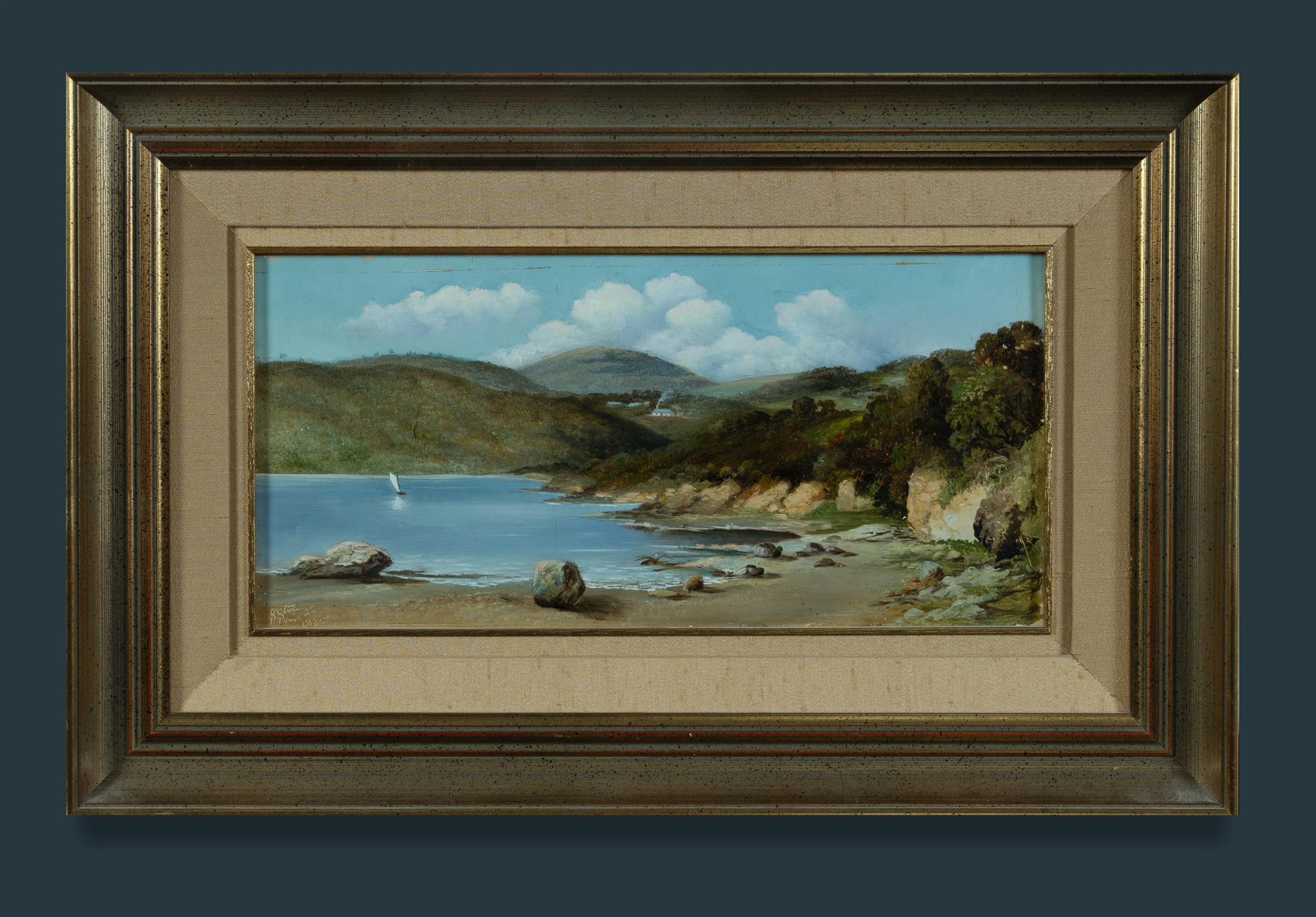 POWER, Peter (1834-1918) Solitary Boat in Bay with Distant Dwellings, 1884. Oil on Board 16.5x35cmEstimate $400-700