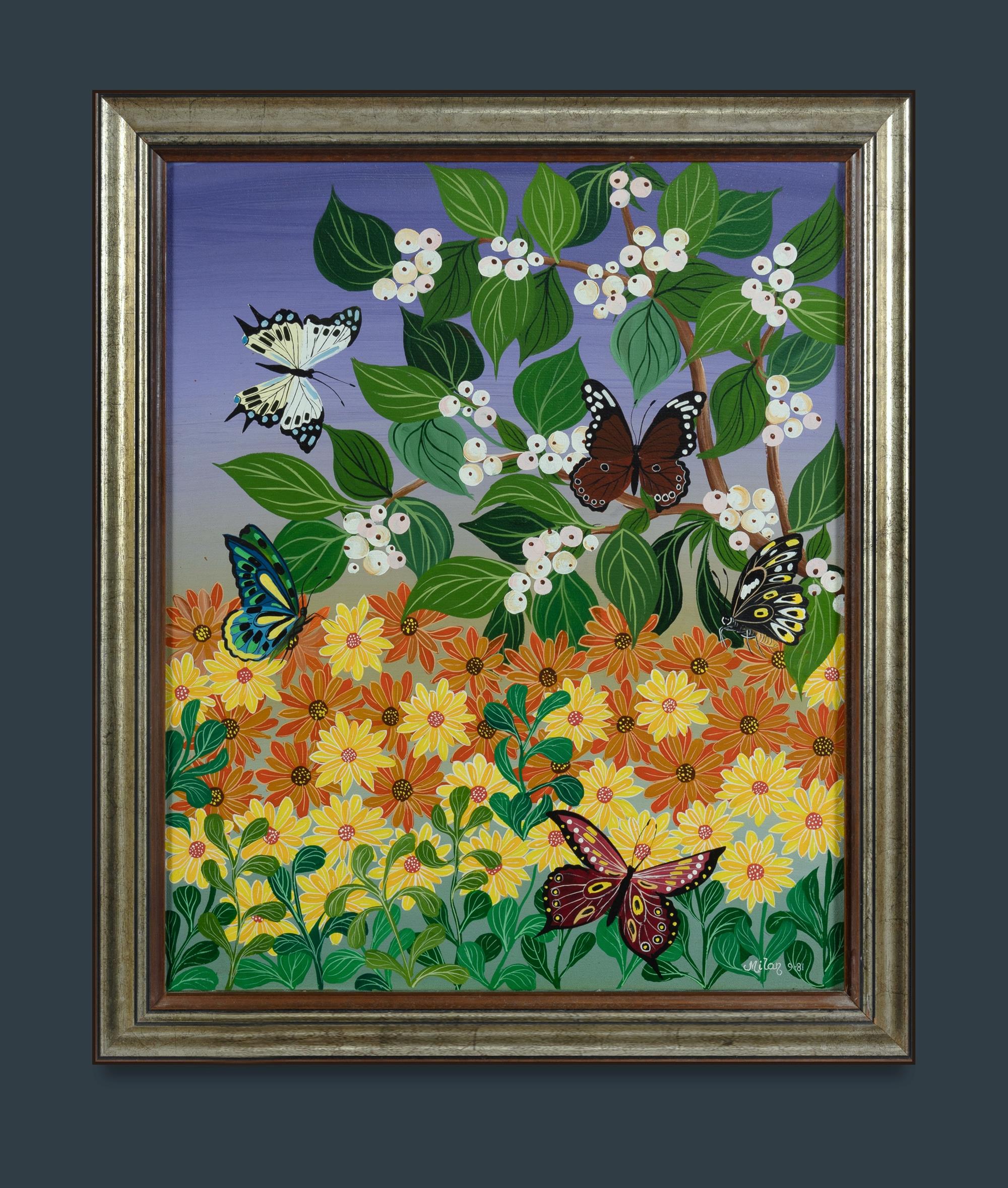 TODD, Milan (1922-2018) 'Butterflies Garden II,' 1981. Anvil Art Gallery, Wodonga, label verso. Acrylic on Canvas 60x49cmEstimate $400-700