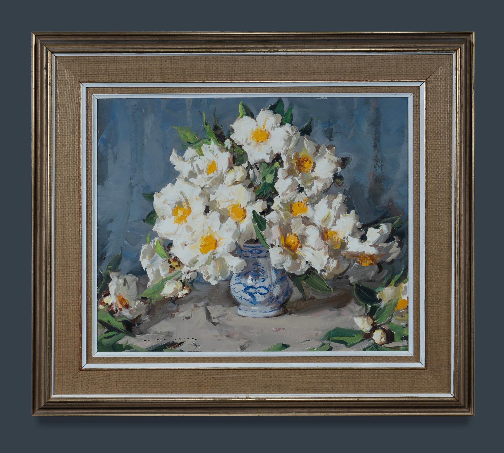 BAKER, Alan Douglas (1914-1987) Camellias in a Blue and White Vase Oil 45x55cmEstimate $1,500-2,500