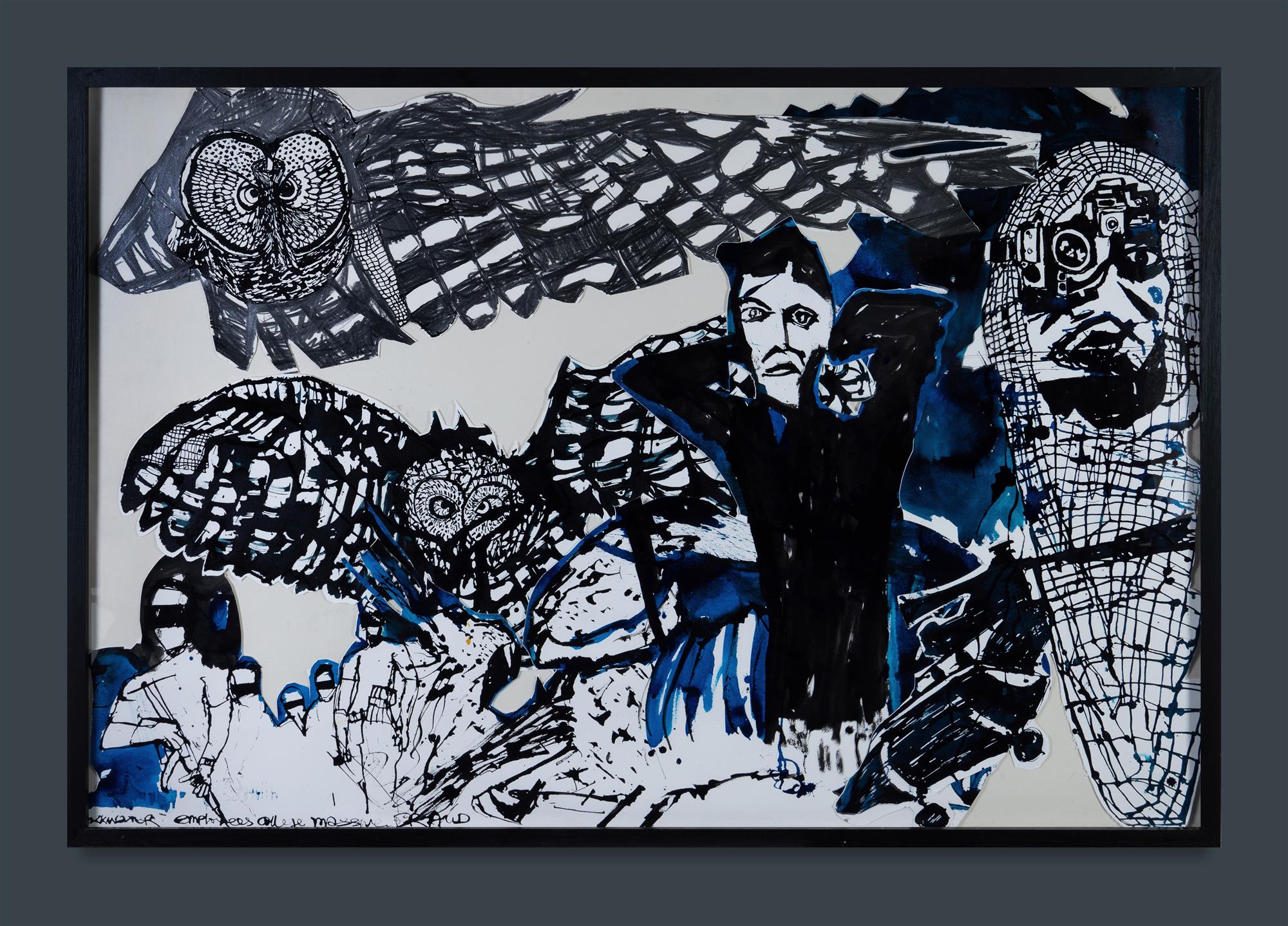 JONES, Locust (b.1963) '[...] Employees Allege Massive Fraud,' c.2010. Unsigned. Inscribed lower left. Ex. Dominik Mersch Gallery, Sydney. Ink & Graphite on Paper Cutouts 98x147cm (irreg.) 103.5x153cm (frame)Estimate $400-700
