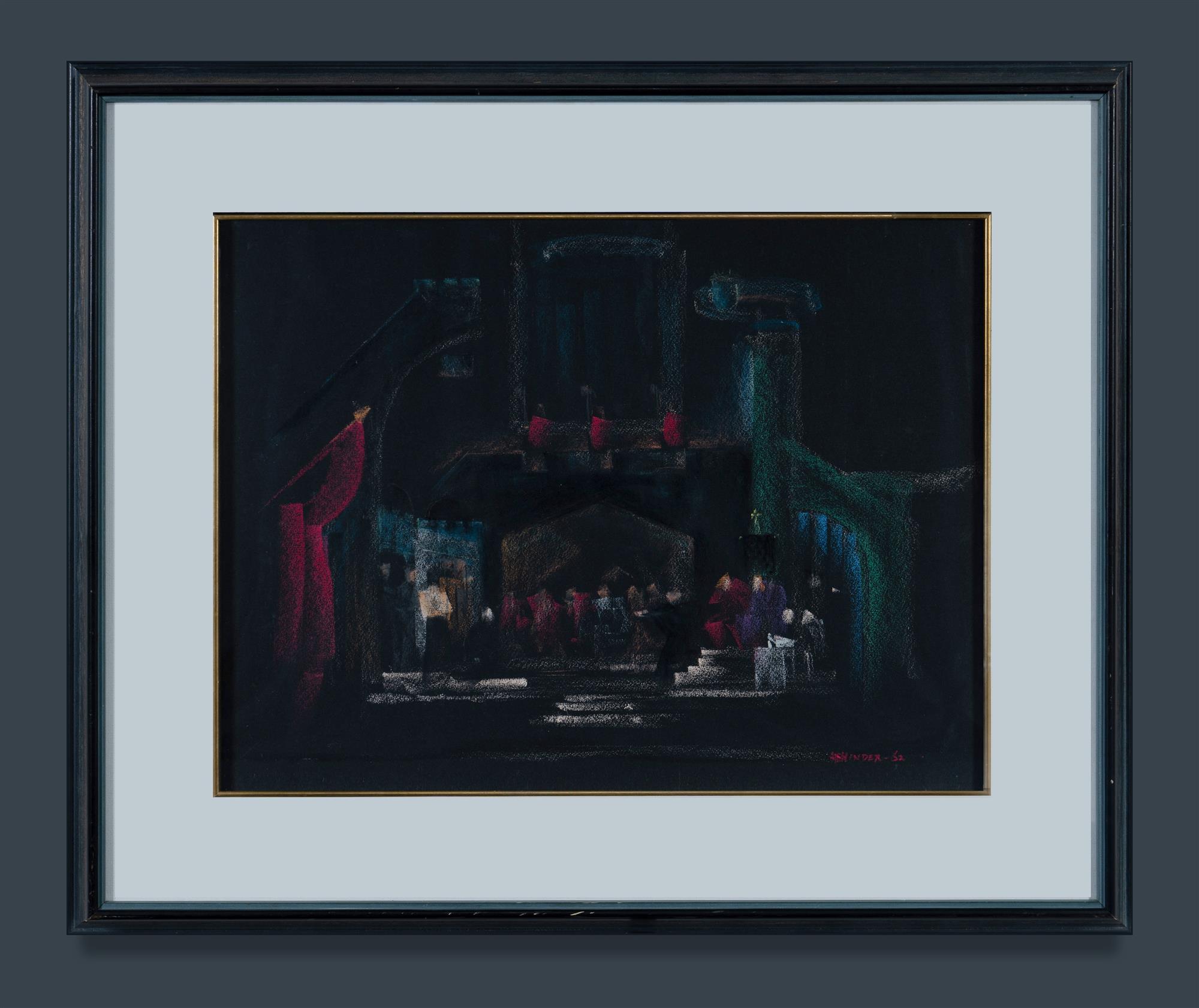 HINDER, F C (Frank) (1906-1992) 'Trial, Saint Joan, Bonython Hall, Adelaide,' 1962. Inscribed verso. Pastel on Black Paper 44x59cmEstimate $600-1,000
