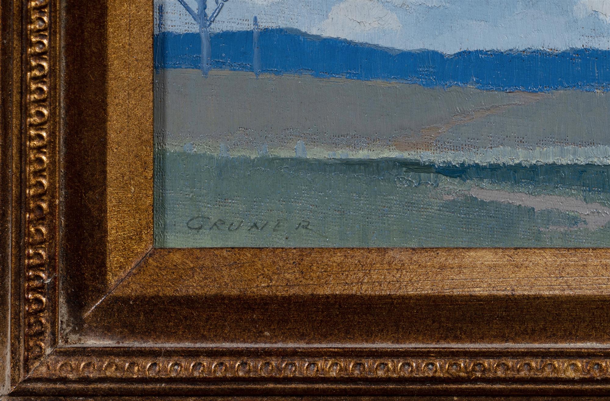 GRUNER, Elioth (1882-1939) Rural Property Under Cloudy Skies Signed (incised) 'GRUNER' lower left. Sketch verso of European gardens (possibly Versailles). Oil on Canvas on Board (double sided) 20x25.5cm PROVENANCE: Sotheby's Melbourne 24th July 1988 (lot 257); private collection, Sydney.Estimate $12,000-18,000