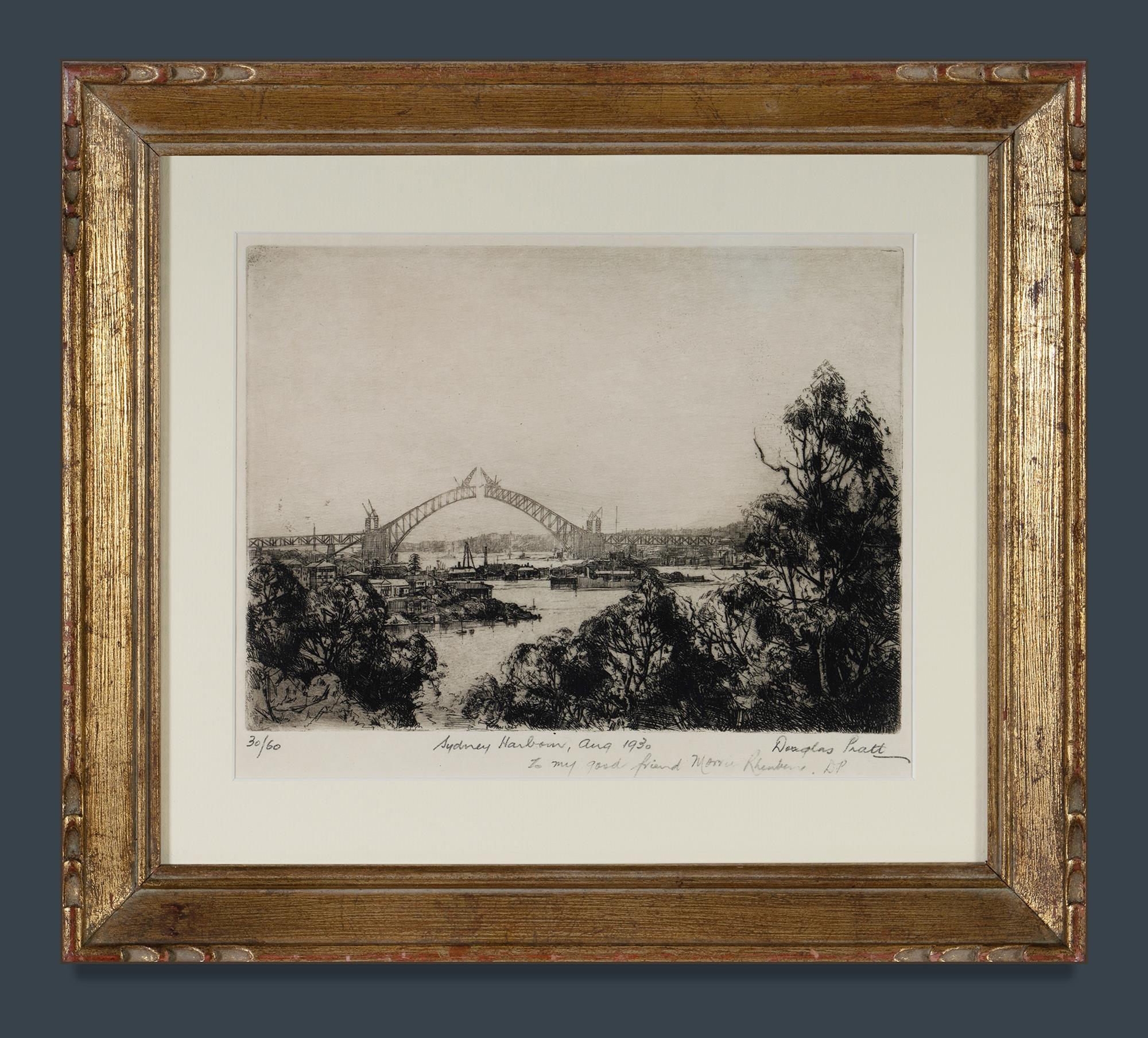 PRATT, Douglas (1900-1972) 'Sydney Harbour, Aug. 1930. With artist dedication. Etching 30/60 20.5x27.5cm PROVENANCE: Seeing Sydney Harbour, Collection of Jim Haynes OAM and Robyn McMillan.Estimate $300-500