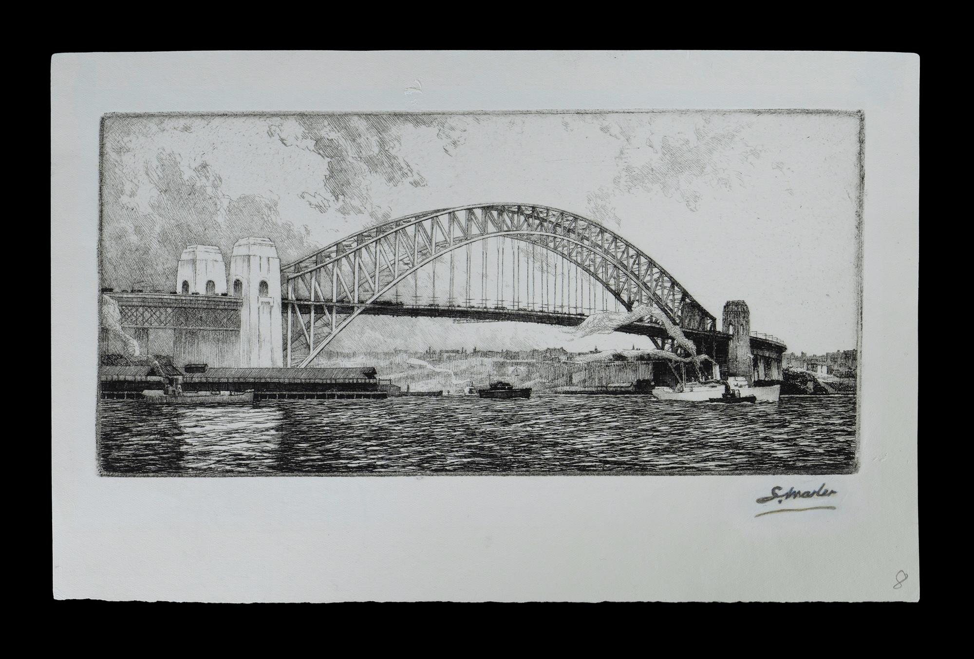 WARNER, A E (1879-1968) Sydney Harbour Bridge Signed indistinctly 'G Marler' a known pseudonym of the artist. Etching 11x23.5cm PROVENANCE: Seeing Sydney Harbour, Collection of Jim Haynes OAM and Robyn McMillan.Estimate $100-200