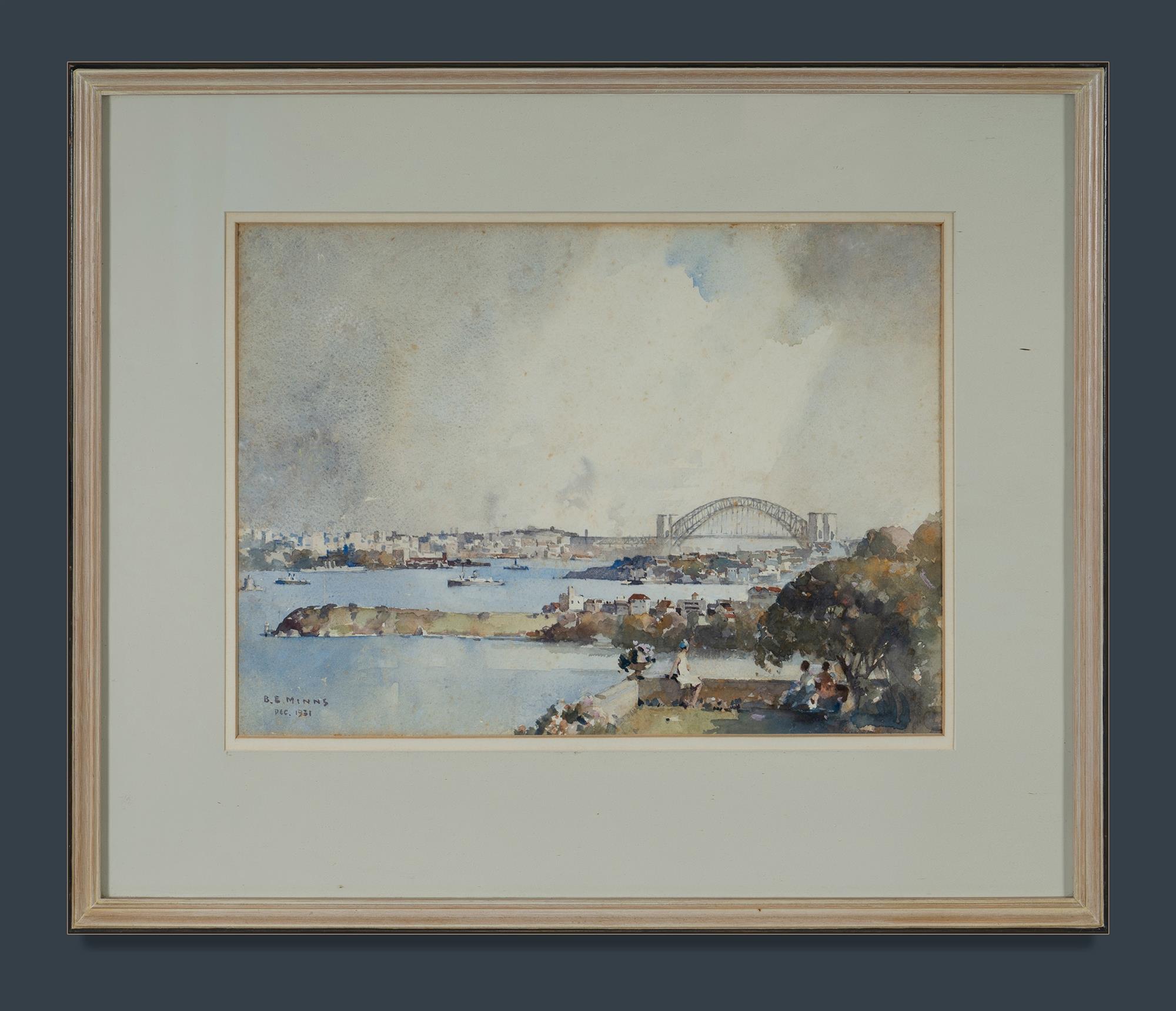 MINNS, Benjamin E (1864-1937) Sydney Harbour and Bridge, Dec. 1931. W/Clr 26.5x36.5cm PROVENANCE: Seeing Sydney Harbour, Collection of Jim Haynes OAM and Robyn McMillan.Estimate $2,000-3,000