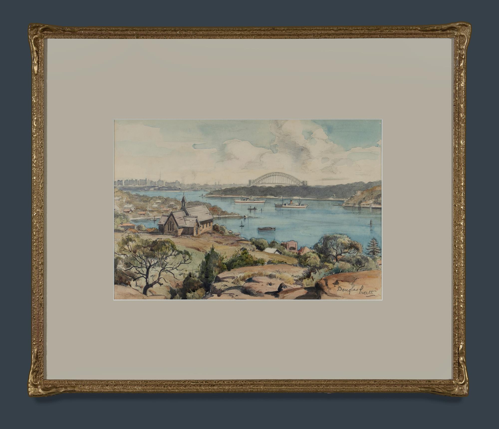 PRATT, Douglas (1900-1972) Sydney Harbour Bridge - viewed from near St Peter's Anglican Church, Watsons Bay W/Clr 23.5x35cm PROVENANCE: Seeing Sydney Harbour, Collection of Jim Haynes OAM and Robyn McMillan.Estimate $400-700