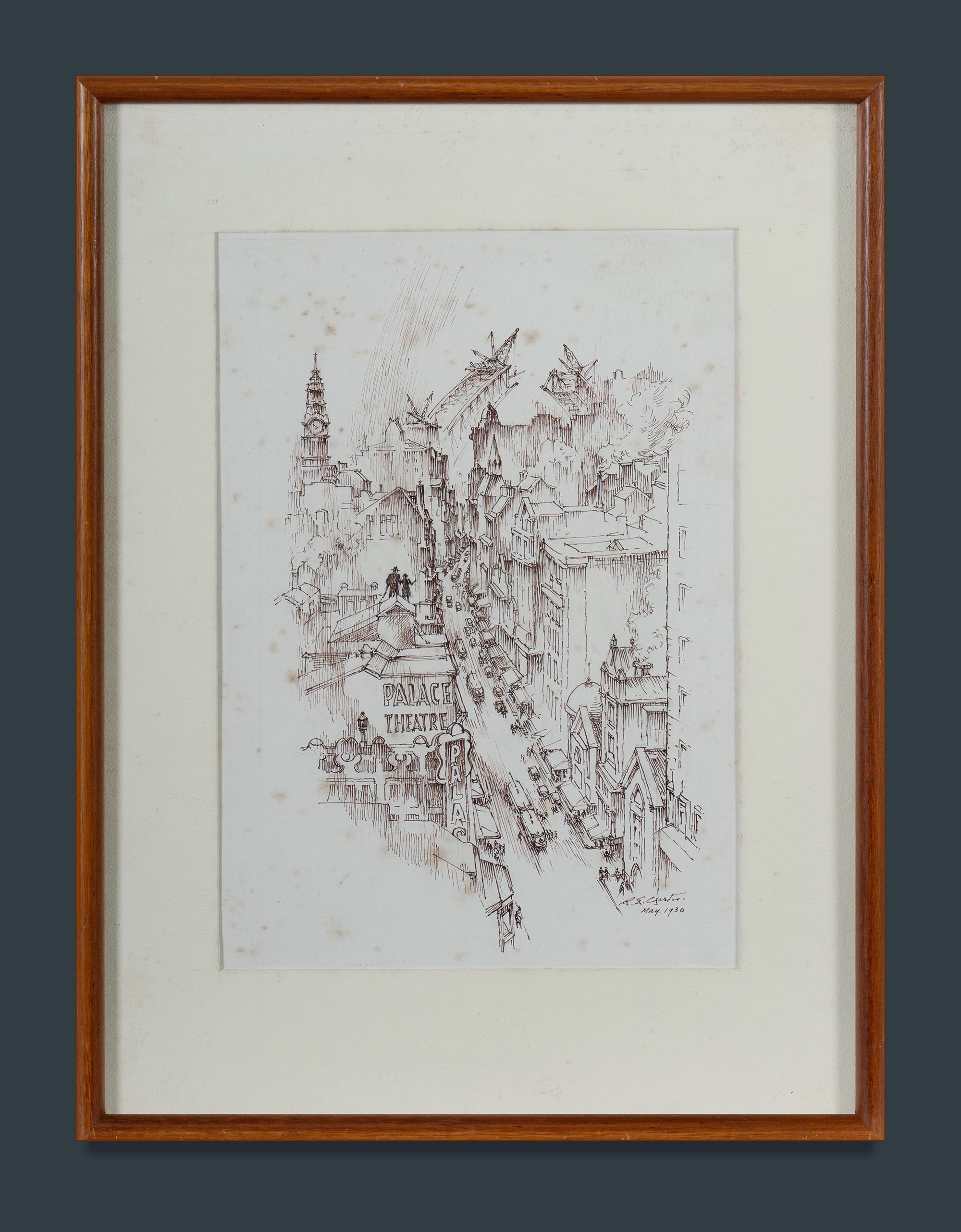 CURTIS, R Emerson (1898-1996) 'Pitt St Looking North and Bridge Construction in 1930 (Sydney Series)' Pen & Ink 29x20.5cm PROVENANCE: Seeing Sydney Harbour, Collection of Jim Haynes OAM and Robyn McMillan.Estimate $200-400