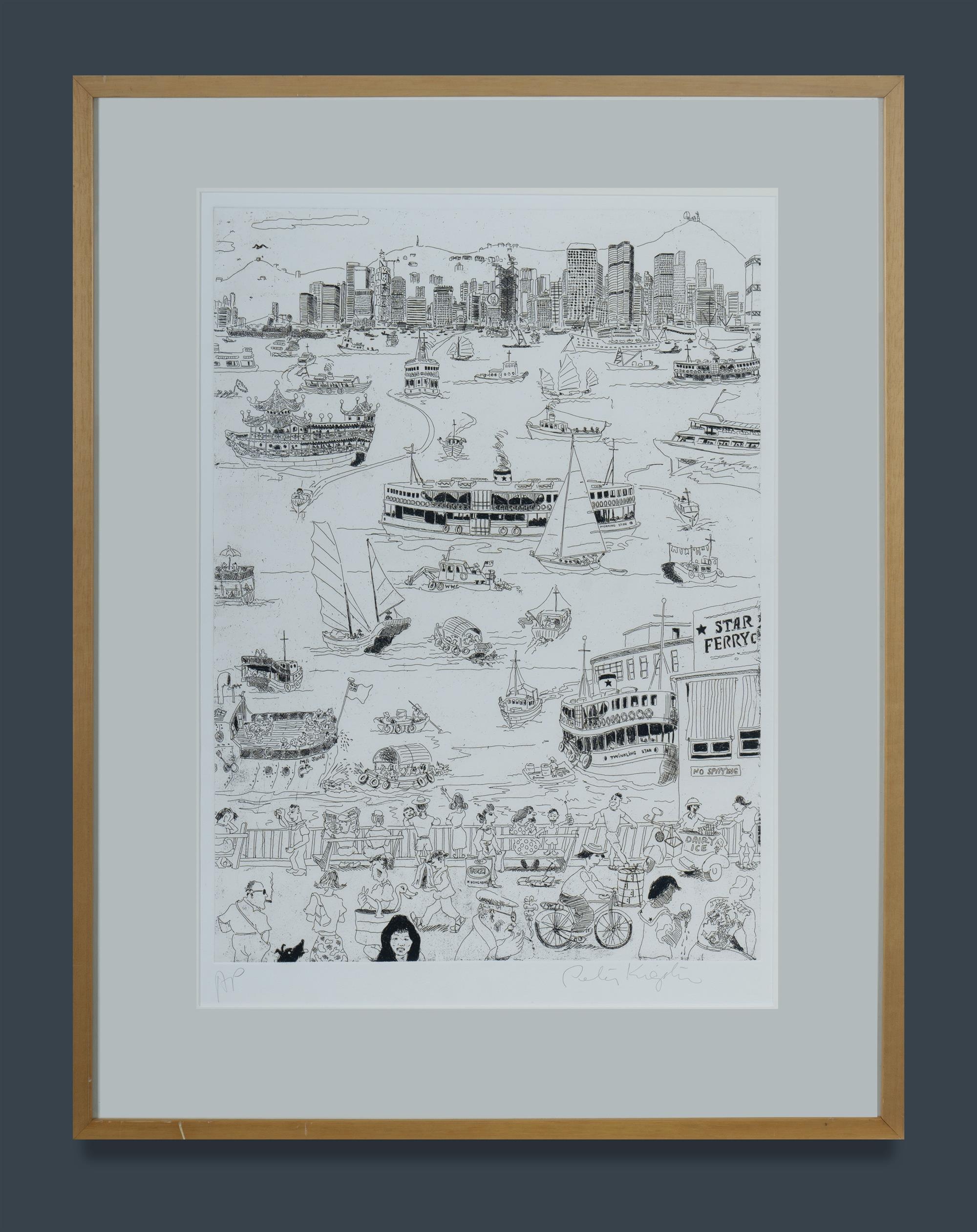 KINGSTON, Peter (1943-2022) Hong Kong Harbour, c.1987. Only a few proofs of this work were created; no edition was produced. Label verso for Josef Lebovic Gallery. Etching A/P 60.5x44.5cm