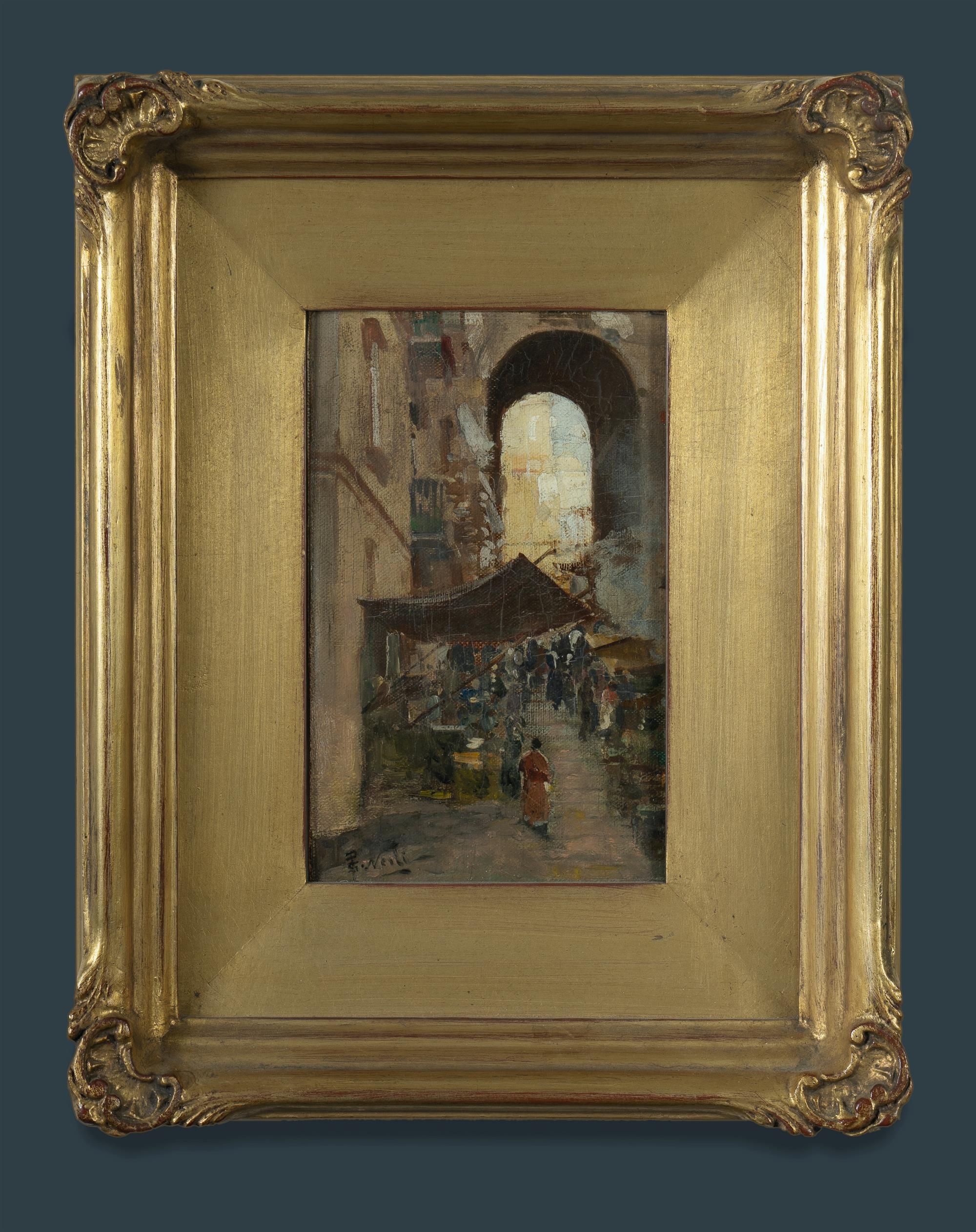 NERLI, Girolamo (1860-1926) Cairo Street Scene Label verso for James Makin Gallery, Melbourne. Oil on Canvas on Board 21.5x13.5cm PROVENANCE: Private collection, Victoria; Lawson-Menzies 19th May 2011 (lot 66); private collection, NSW.Estimate $3,000-5,000