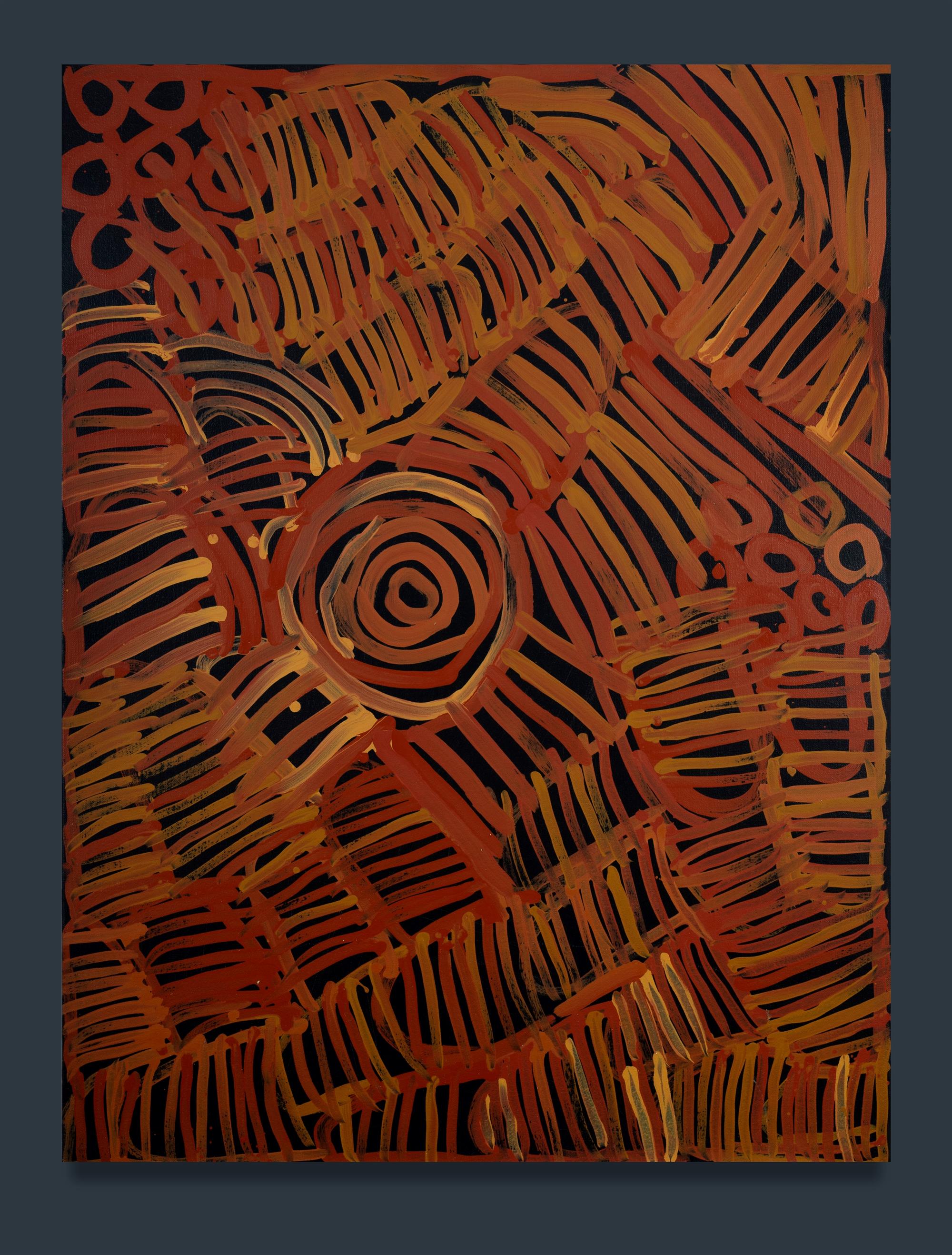 PWERLE, Minnie (Aboriginal 1922-2006) 'Bush Melon,' 2000. Acrylic on Linen 121.5x91.5cm PROVENANCE: Aboriginal Gallery of Dreamings, Melbourne, cat #AGOD9222 - accompanied by certificate of authenticity booklet (incl. photographs).Estimate $3,000-4,500