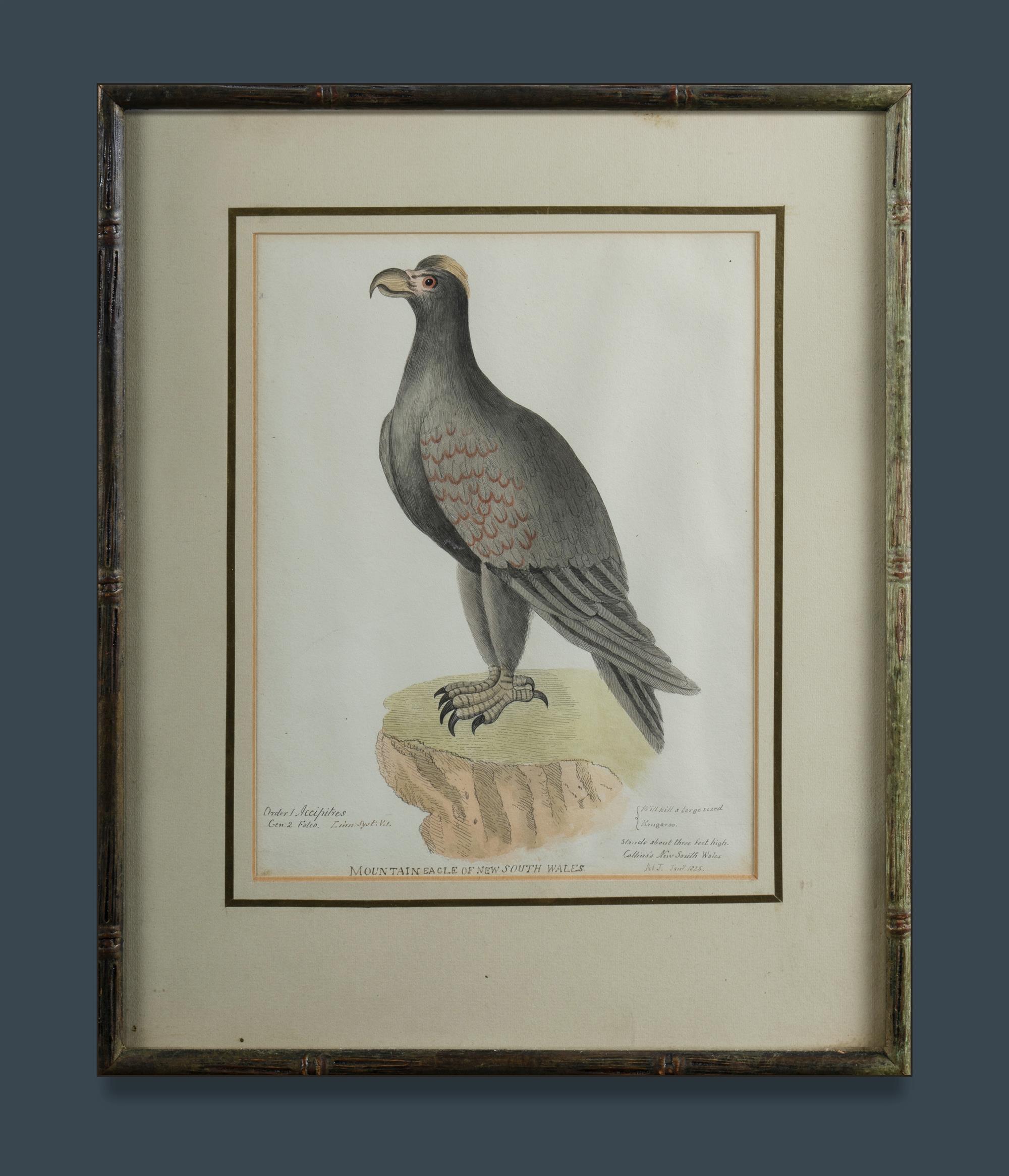 After WATLING, Thomas (British/Australian 1762-1806) 'Mountain Eagle of New South Wales' Inscribed lower right 'M J Jan 1825'. The original Thomas Watling illustration was engraved by Edward Dayes. Ink & W/Clr 22.5x17.5cmEstimate $100-200
