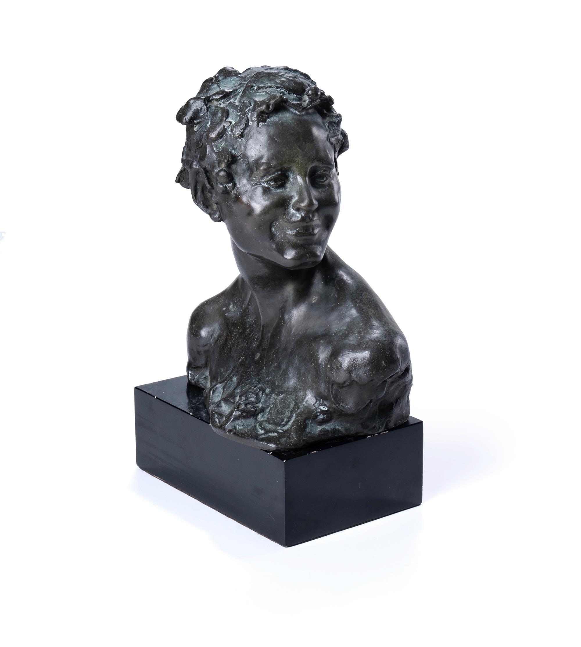 PINA, Alfredo (Italian 1883-1966) 'Head of Bacchus' Signed verso 'A. Pina', and with foundry seal 'Cire Perdue AG Paris'. Bronze on Wooden Plinth H25cm PROVENANCE: Christie's, Sydney, 3 October 1973 (lot 301); private collection, Sydney.Estimate $1,000-2,000
