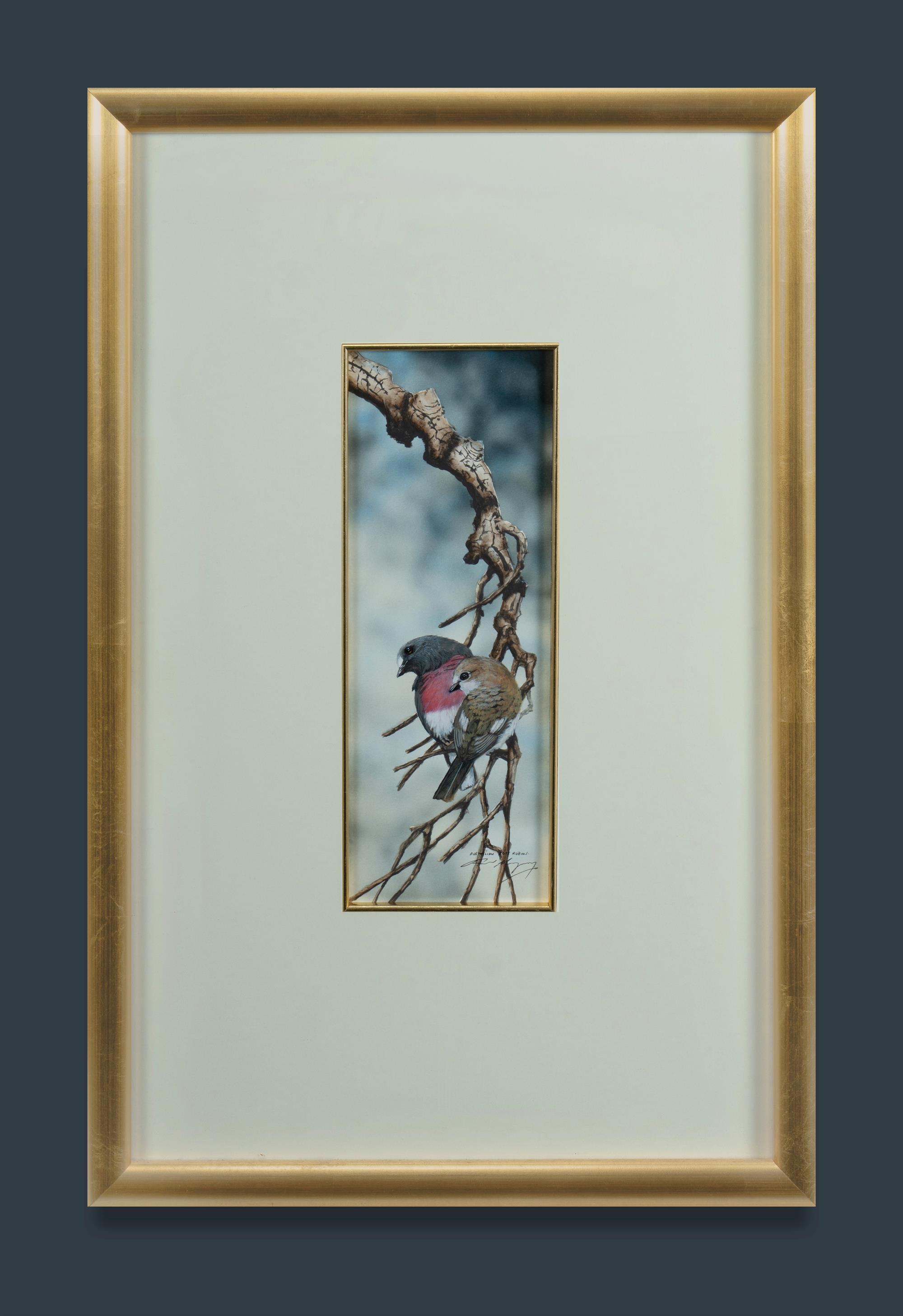 MARGOCSY, Paul (b.1945) 'Australian Rose Robins' Dedication from the artist dated 2007 verso. W/Clr & Gouache 29.5x11cmEstimate $250-450