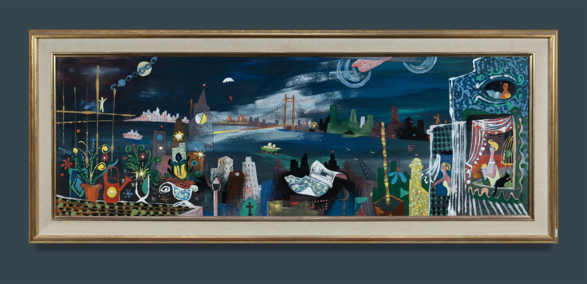 HESLING, Bernard (1905-1987) San Francisco Night, 1958. An early vitreous enamel painting by Hesling possibly exhibited at David Jones Art Gallery, Sydney. Vitreous Enamel on Metal 43x127cm PROVENANCE: Private collection, Sydney.Estimate $3,000-5,000