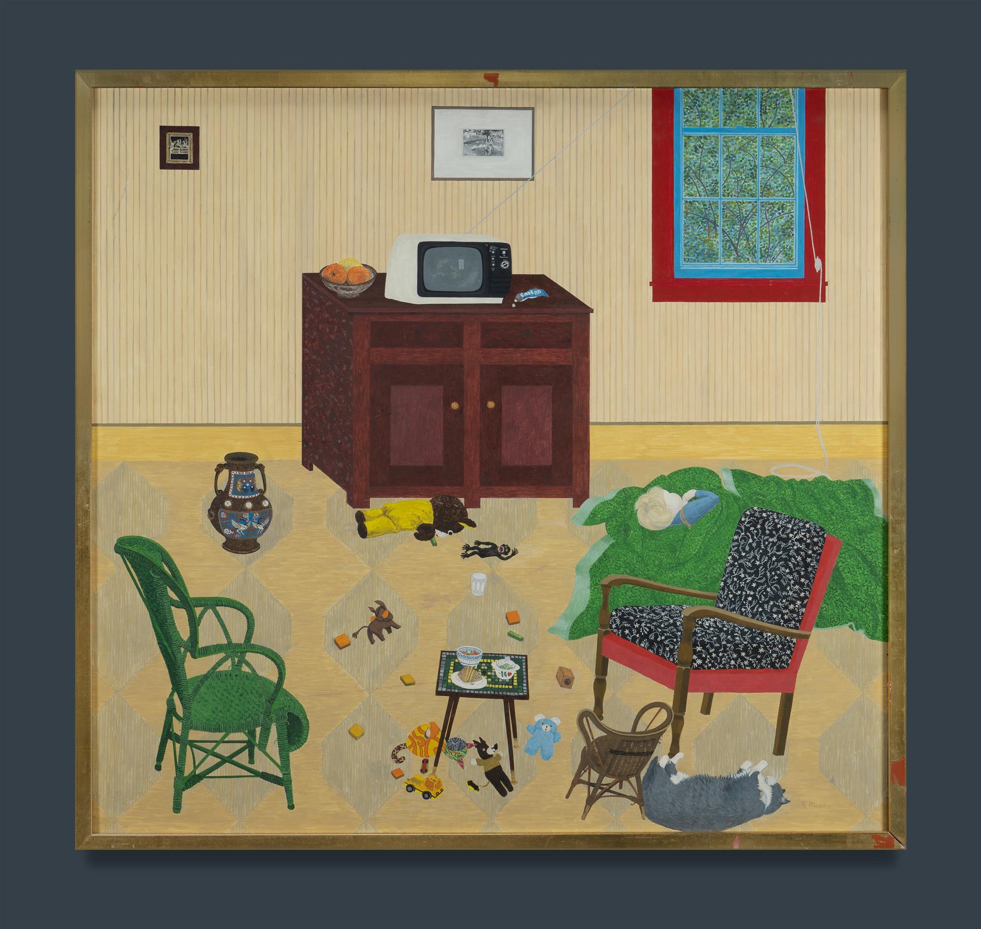 MARKS, Rae (b.1945) Living Room with Sleeping Child Acrylic on Board 90.5x97cm PROVENANCE: Private collection, Sydney.Estimate $800-1,500