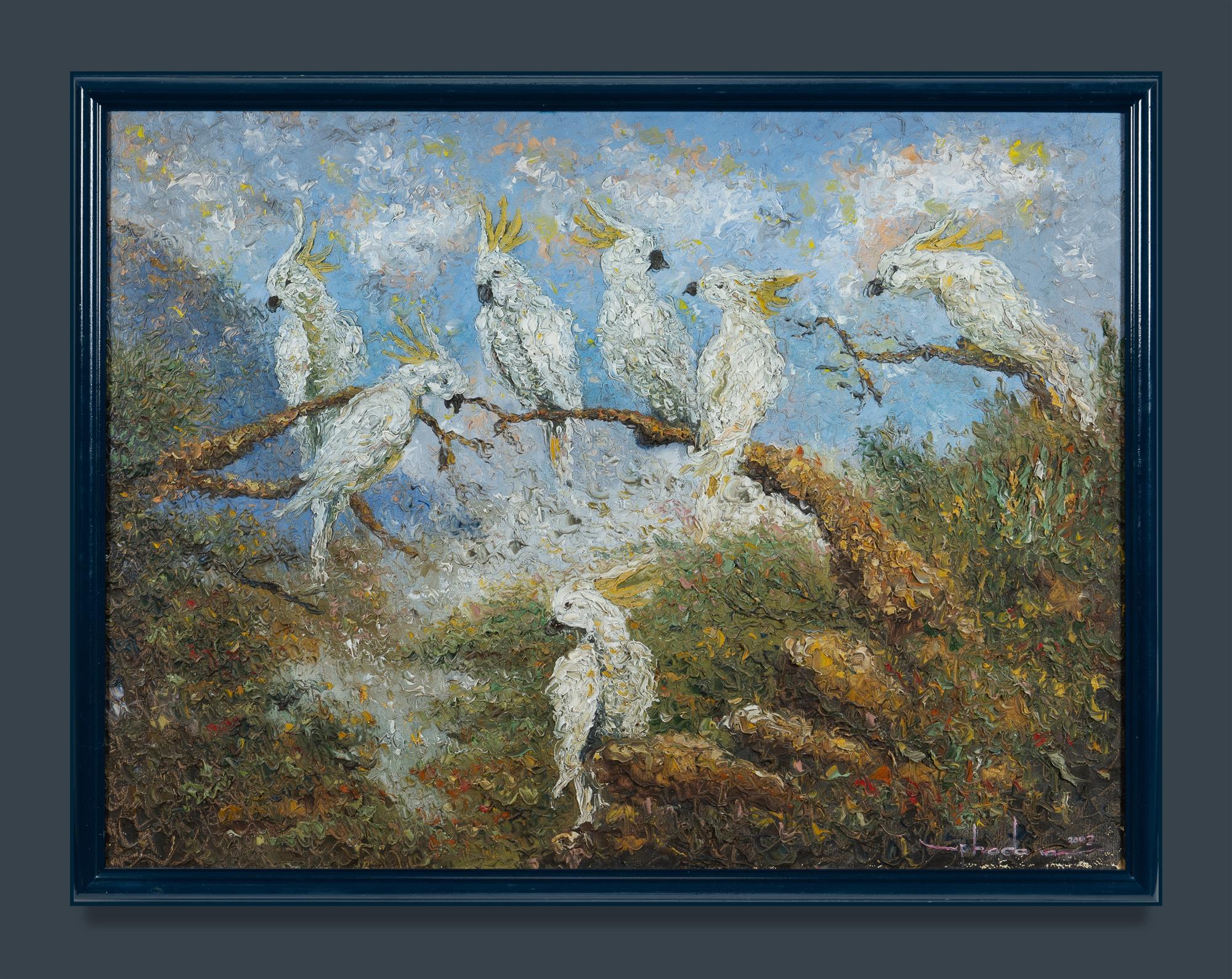 Indonesian School, 'Yellow Crested Cockatoos' Signed indistinctly lower right and dated 2002. Oil on Board 58x78cmEstimate $100-200