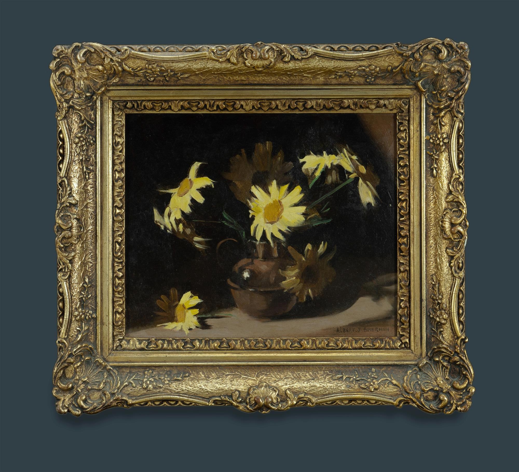 SHERMAN, Albert (1882-1971) Yellow Daisies in Vase Oil on Board 24.5x29.5cmEstimate $500-800