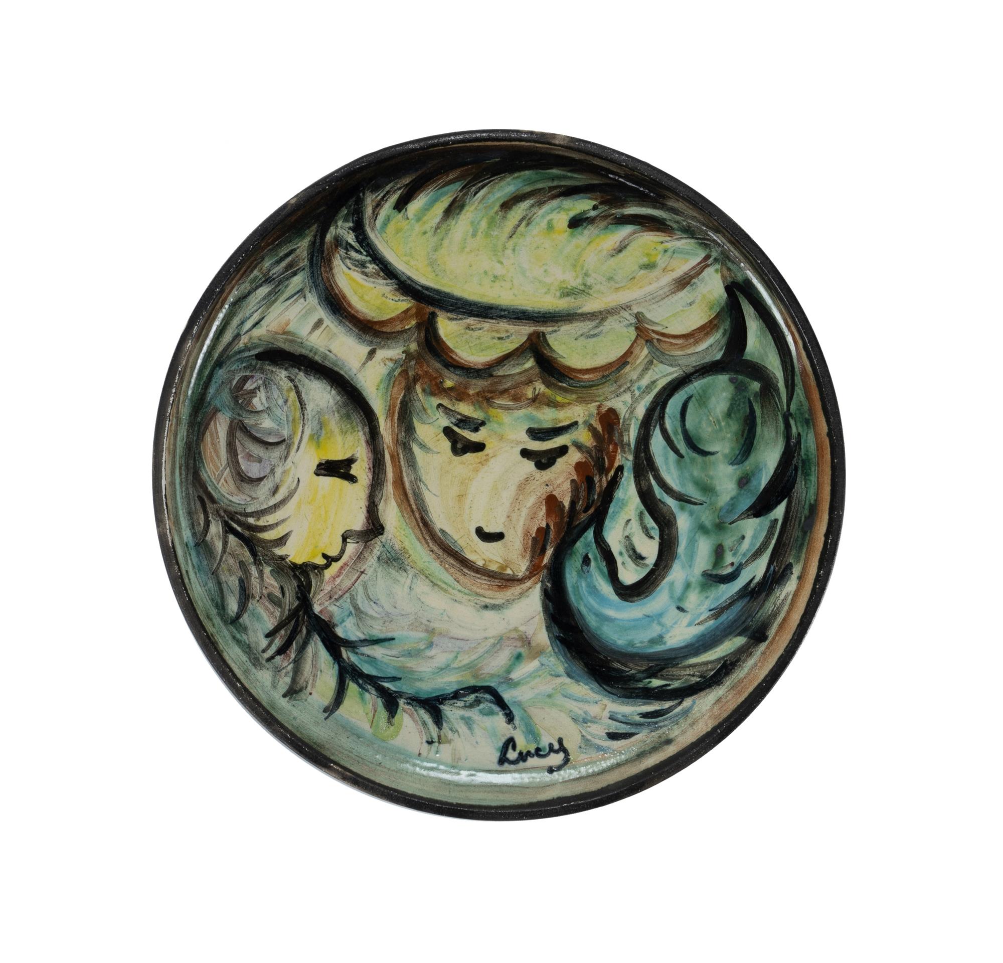 BECK, Lucy Boyd (1916-2009) (3) 'Untitled - Symphony in Brown' (dia.28cm); 'Figure in Blue' (dia.27cm); and 1 other similar untitled (dia.26.5cm) First two listed with Eva Breuer Gallery labels verso. Hand Plated Pottery Plates (3)