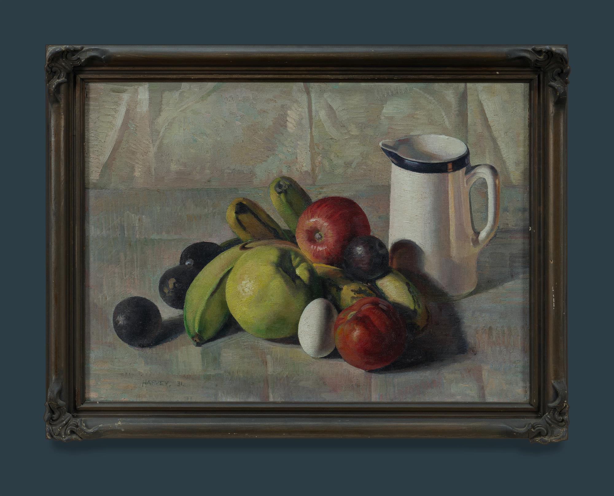 HARVEY, Edmund Arthur (1907-1994) Still Life with Jug and Fruit, 1931. Oil on Canvas 31.5x44.5cmEstimate $800-1,500