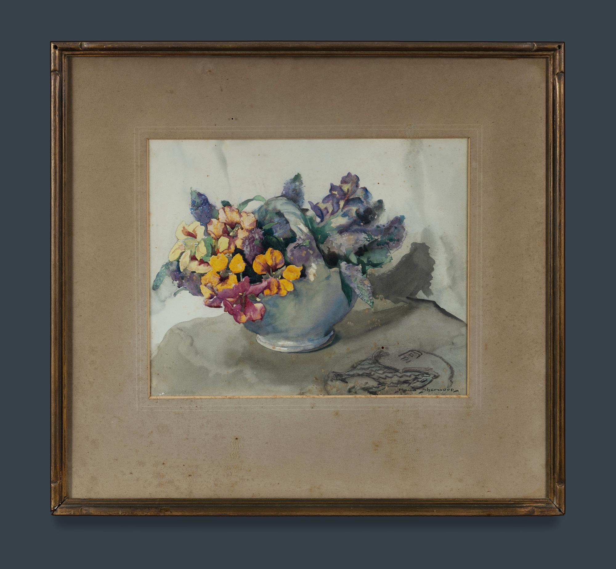SHERWOOD, Maud (New Zealand 1880-1956) 'A Basket of Flowers' Original S.A. Parker Ltd label verso. W/Clr 32x39.5cmEstimate $400-700