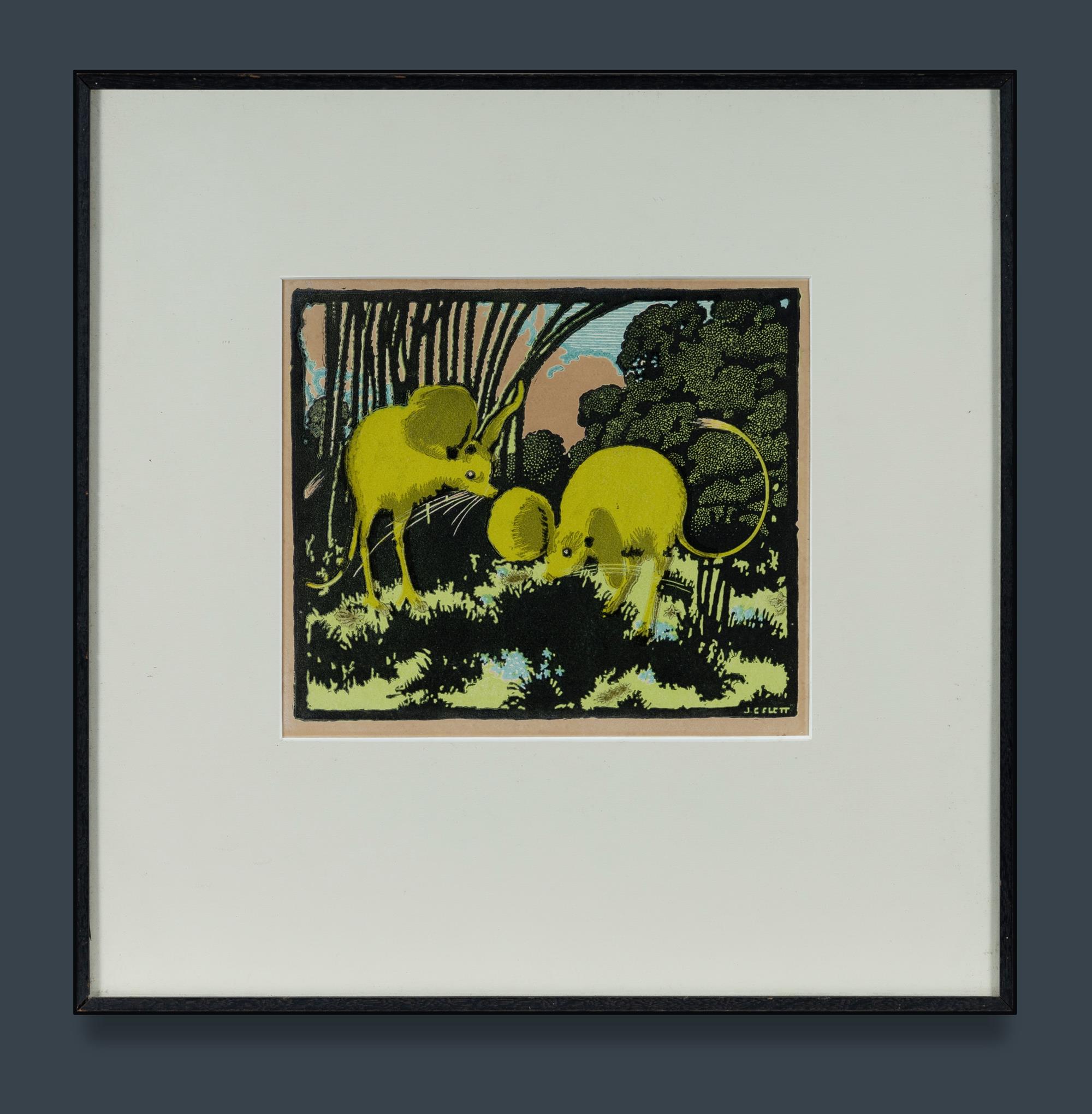 FLETT, James (1906-1986) 'Jerboas' Signed in the plate. Label verso for Thos. Whitelaw & Co. Melbourne. Linocut 21x24.5cm (image) PROVENANCE: Estate Late Margot D Staples, Sydney.Estimate $300-500