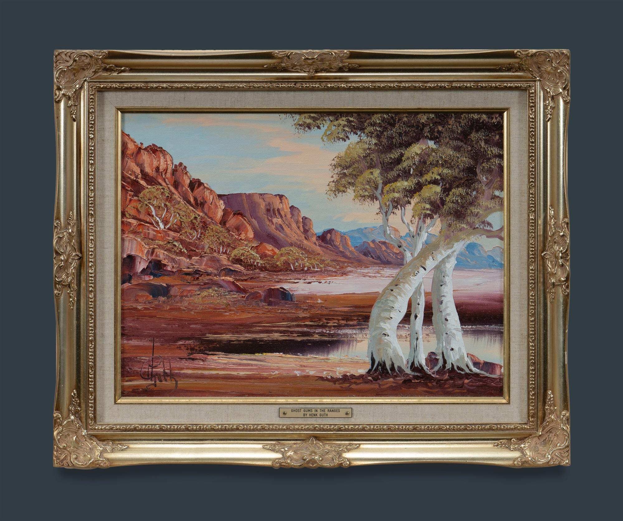 GUTH, Henk (1921- 2003) 'Ghost Gums in the Ranges' Oil on Canvas Board 29.5x39.5cmEstimate $100-200