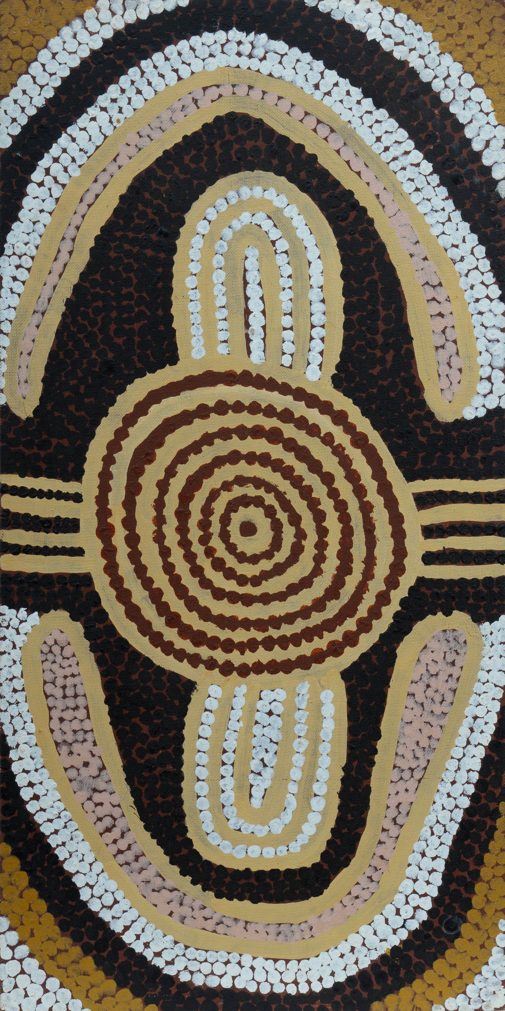 TJANGALA, Uta Uta (Aboriginal 1926-1990) Napanangka and Nangala Women Sitting at Camp at Ngurapalangu, 1989. Acrylic on Canvas Board 61x30.5cm PROVENANCE: Papunya Tula Artists, cat #UU890979 (certificate included)Estimate $2,000-3,000