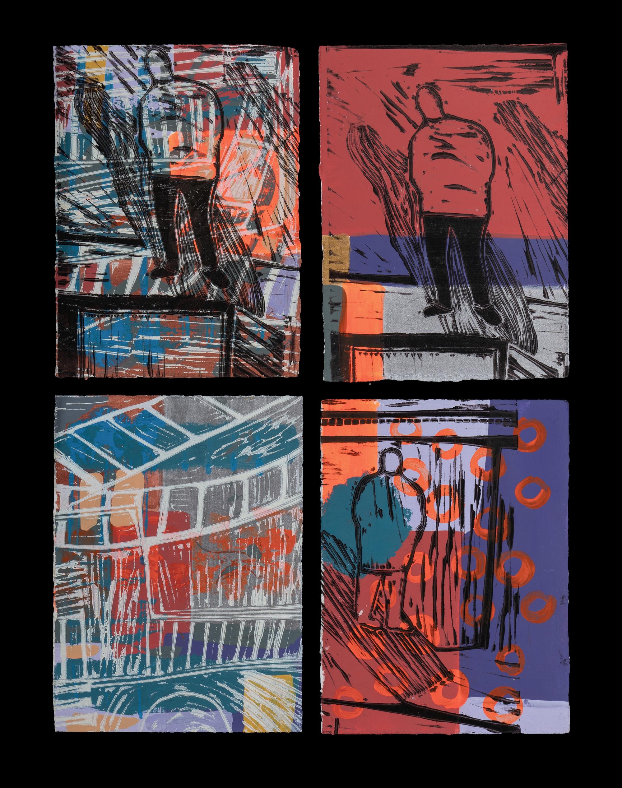 Artist Unknown, (8) Standing Figure in City Settings Unsigned Acrylic on Paper (8) 19x14cm approx. each PROVENANCE: Deceased Estate, QLD.Estimate $80-150